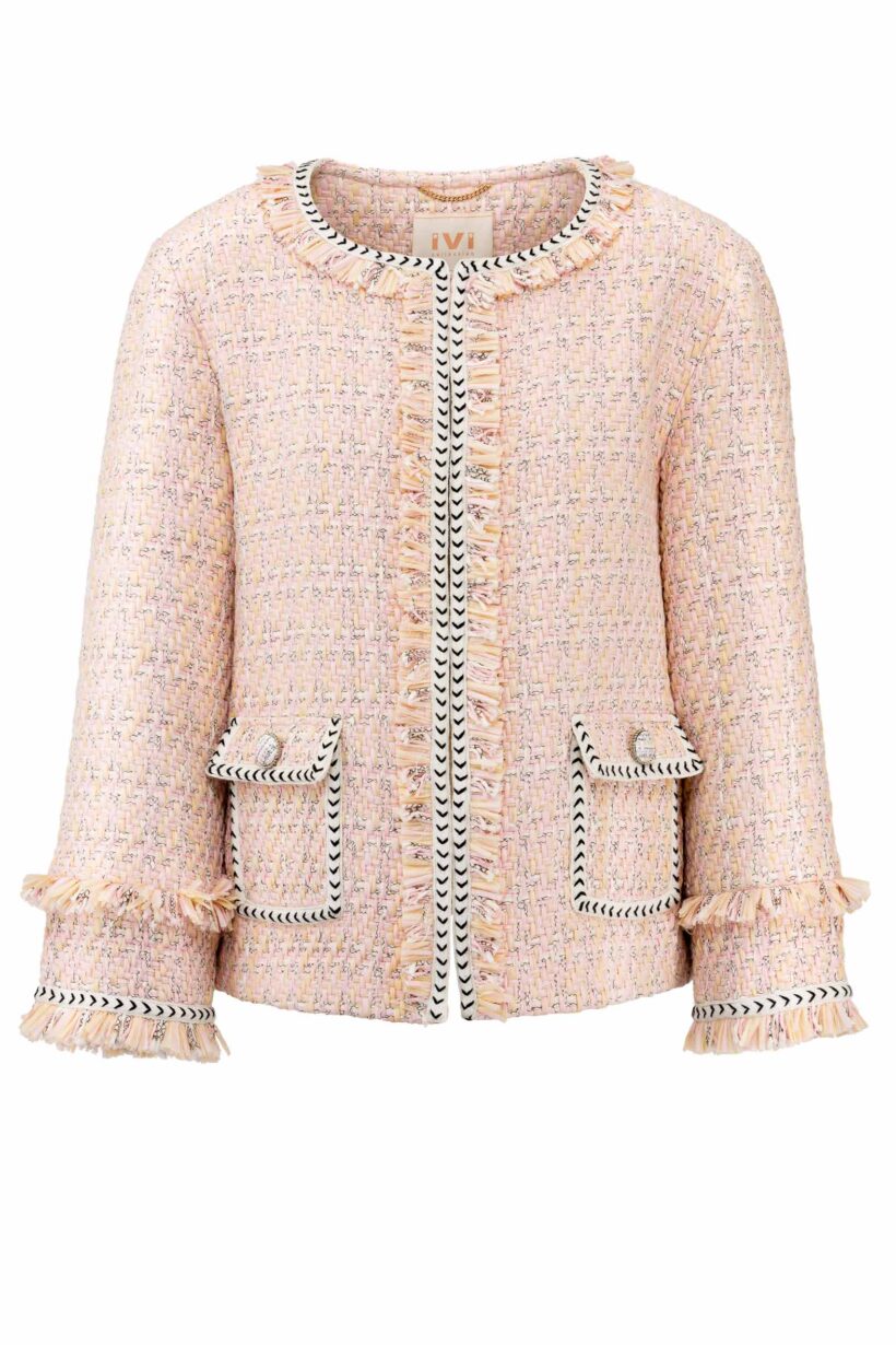 The open edge with decorative trim and fringe can be closed with delicate hooks. A small round neckline and patch pockets with covered decorative buttons complete the iconic look.
