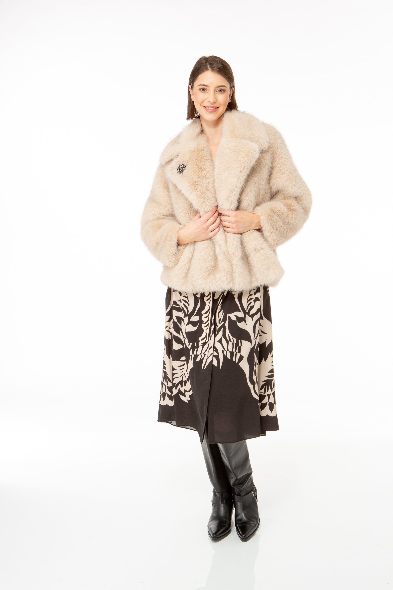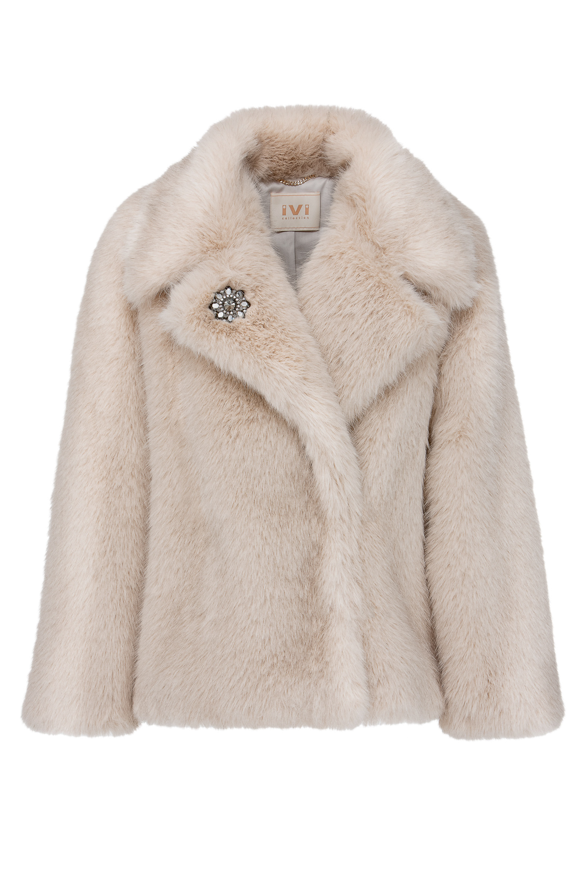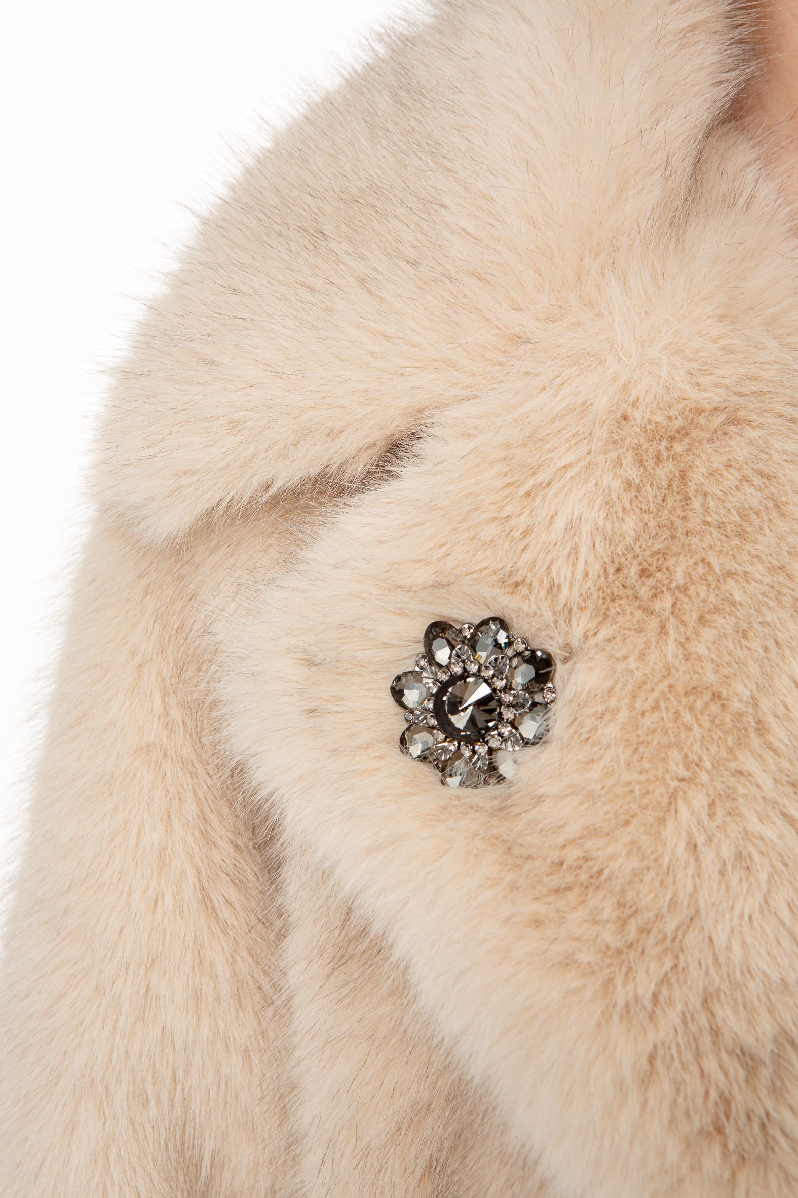 Short jacket with a wide lapel made from fluffy fake fur.