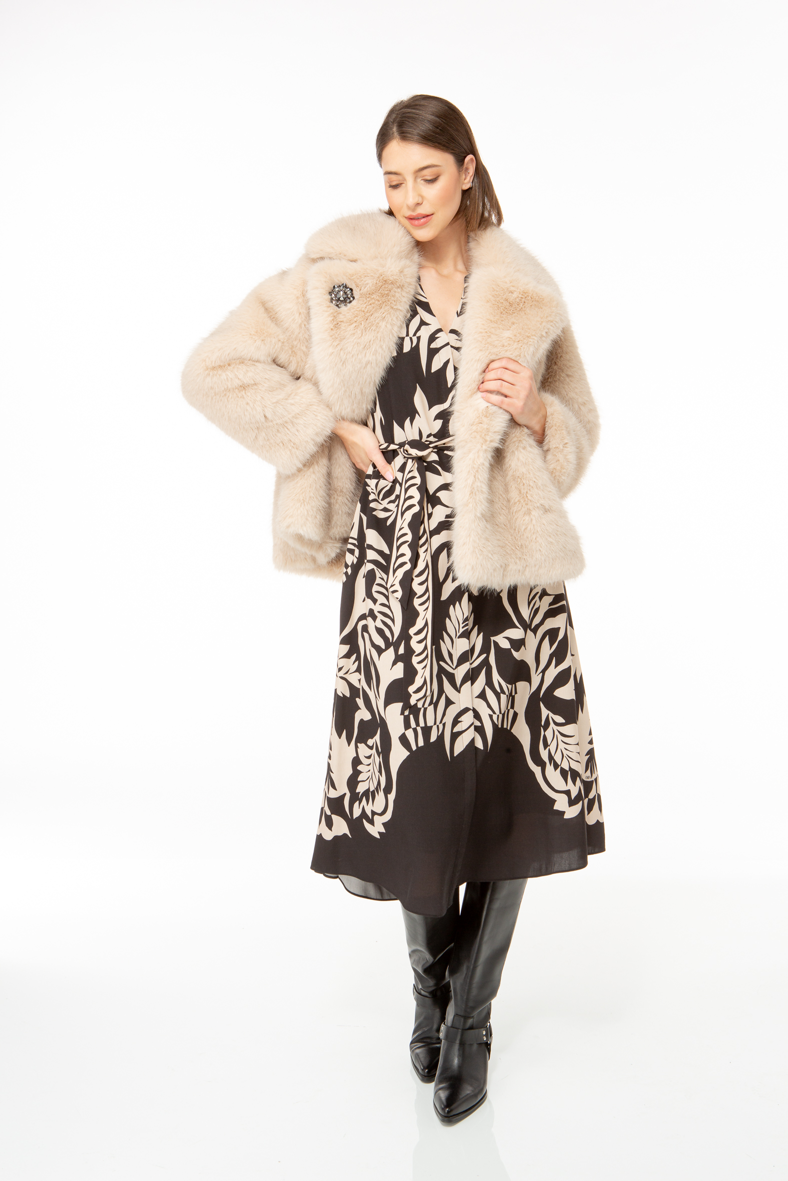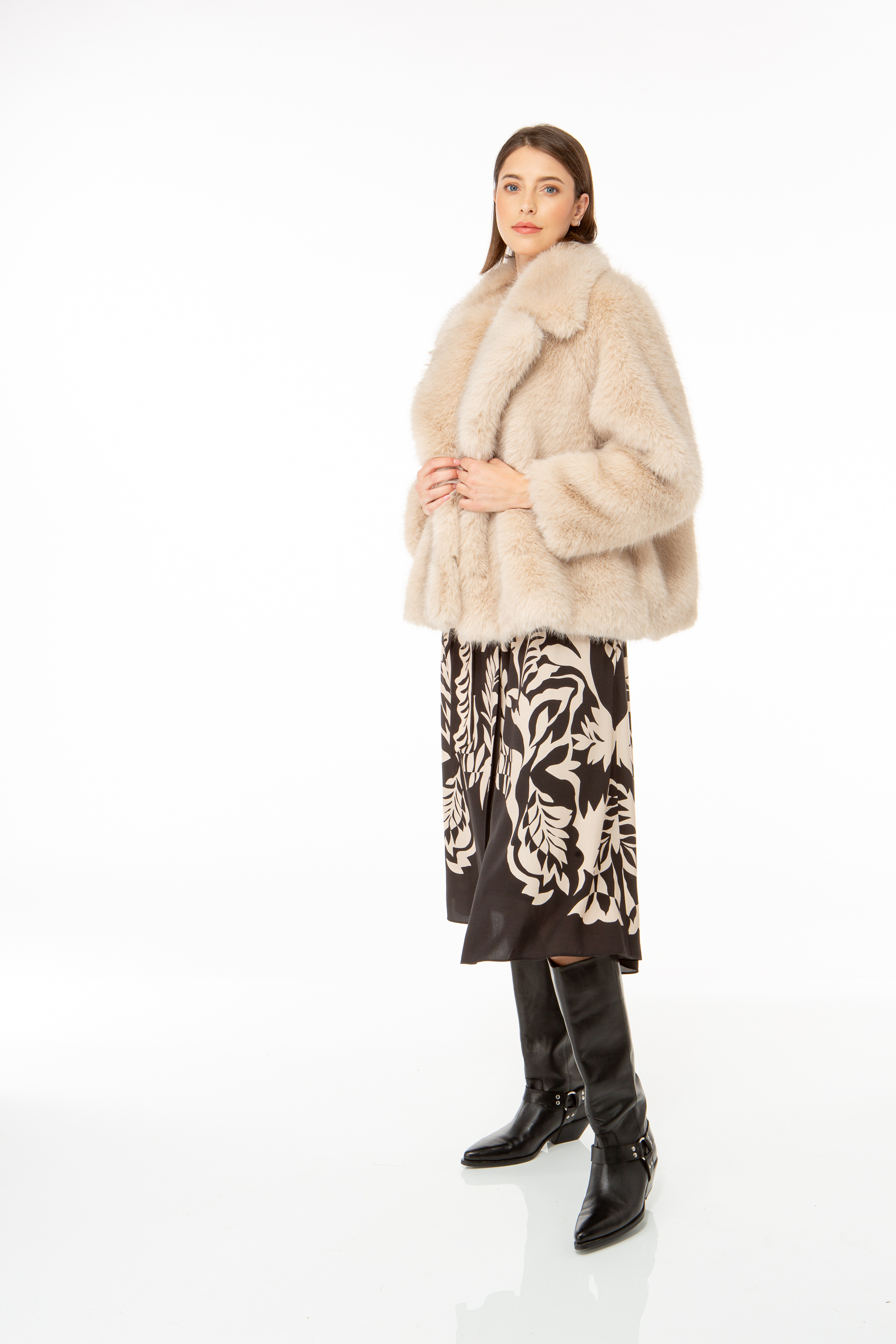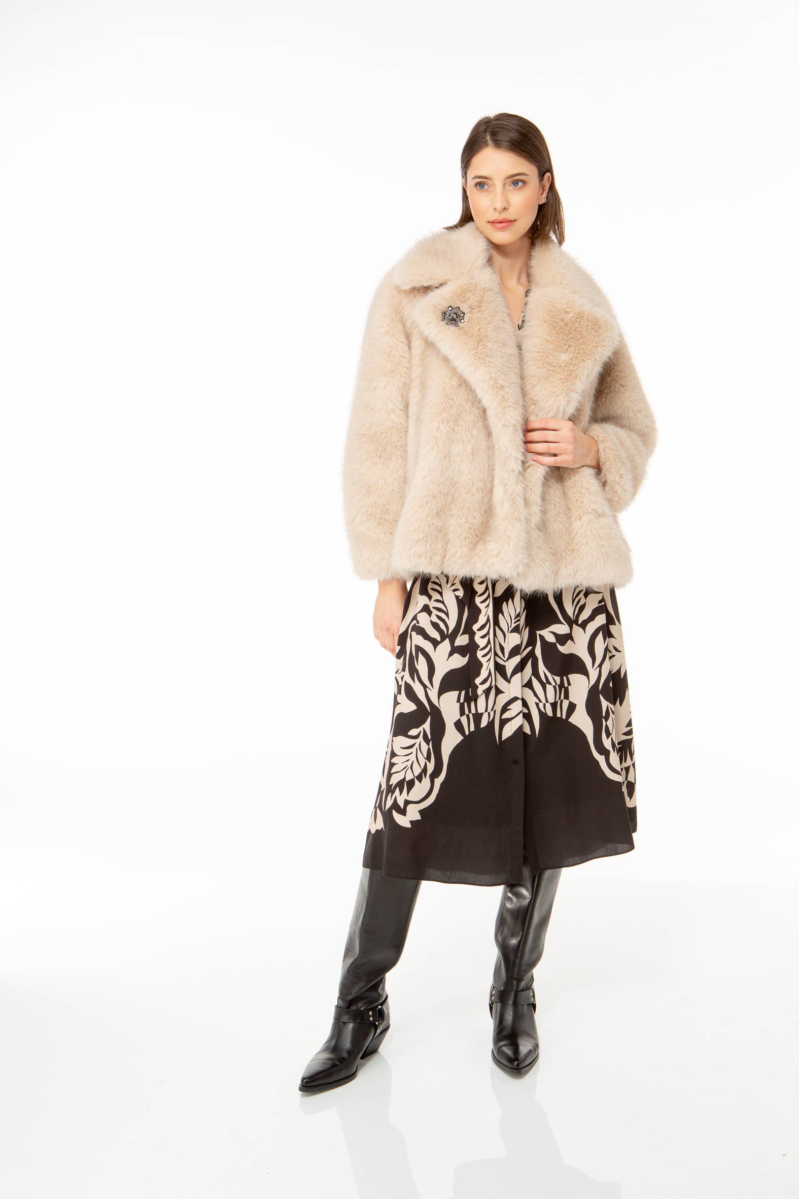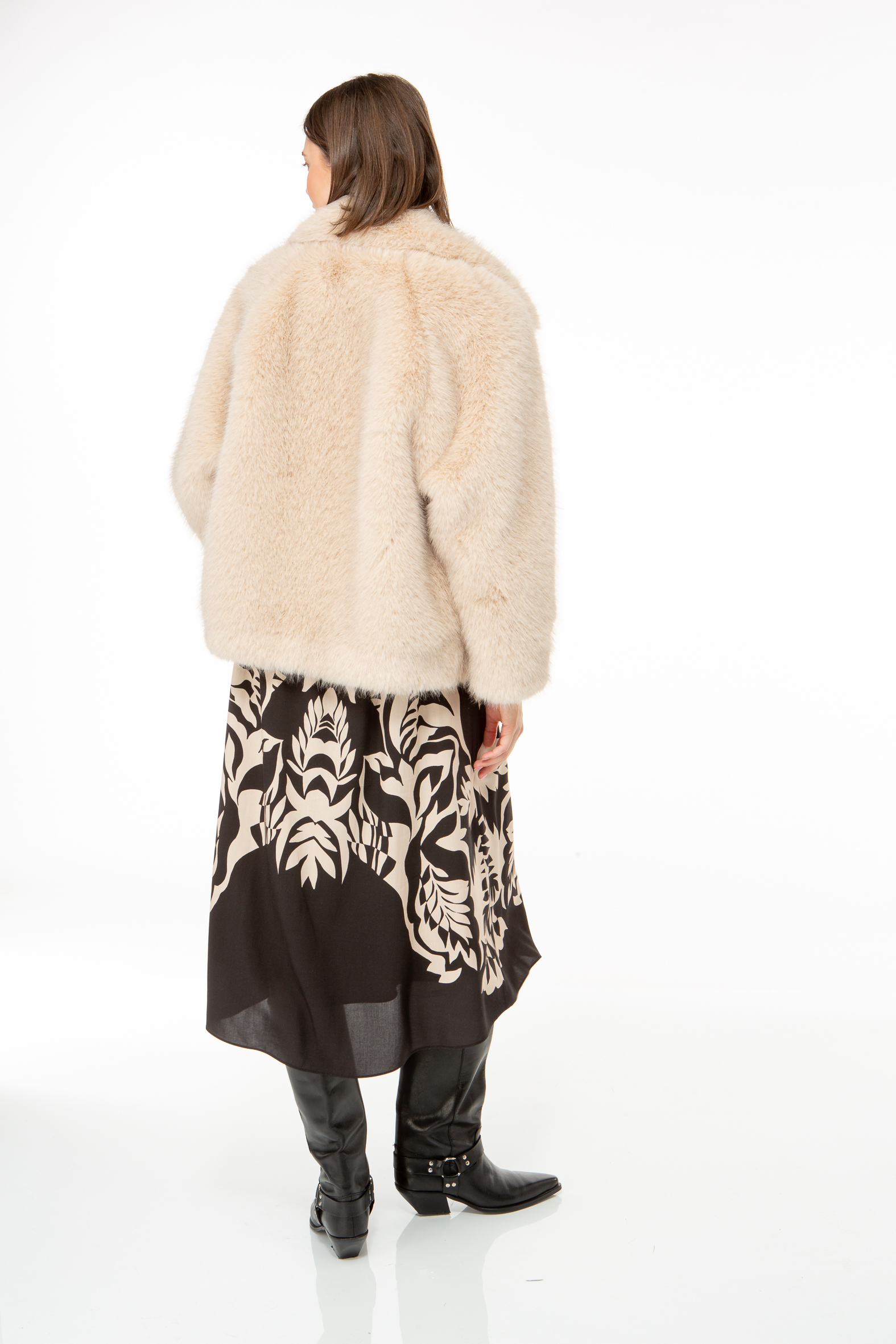 Short jacket with a wide lapel made from fluffy fake fur.