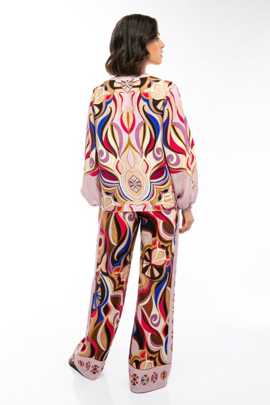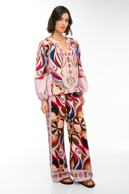 Printed pants with a fine pleat and wide leg made of summery linen fabric.