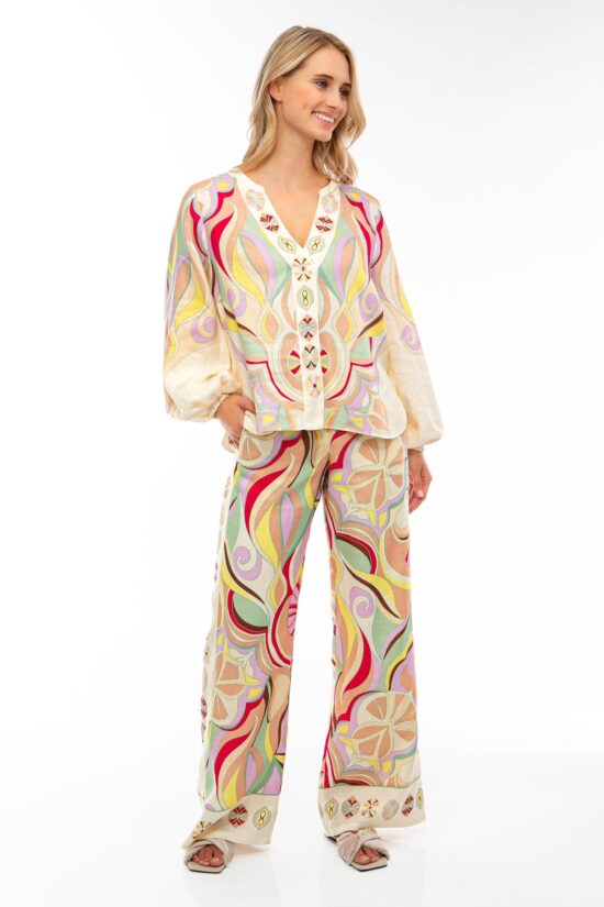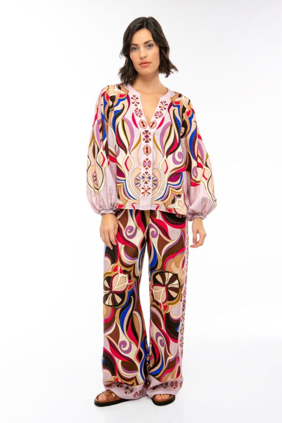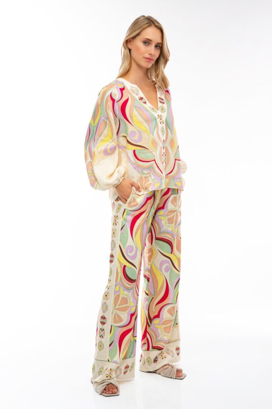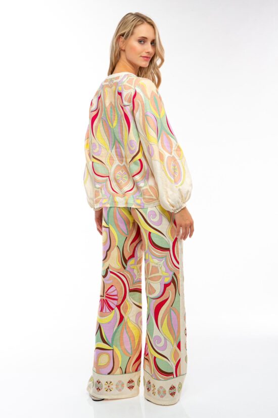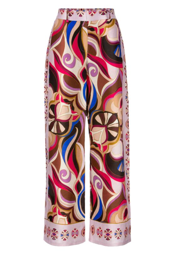 Printed pants with a fine pleat and wide leg made of summery linen fabric.