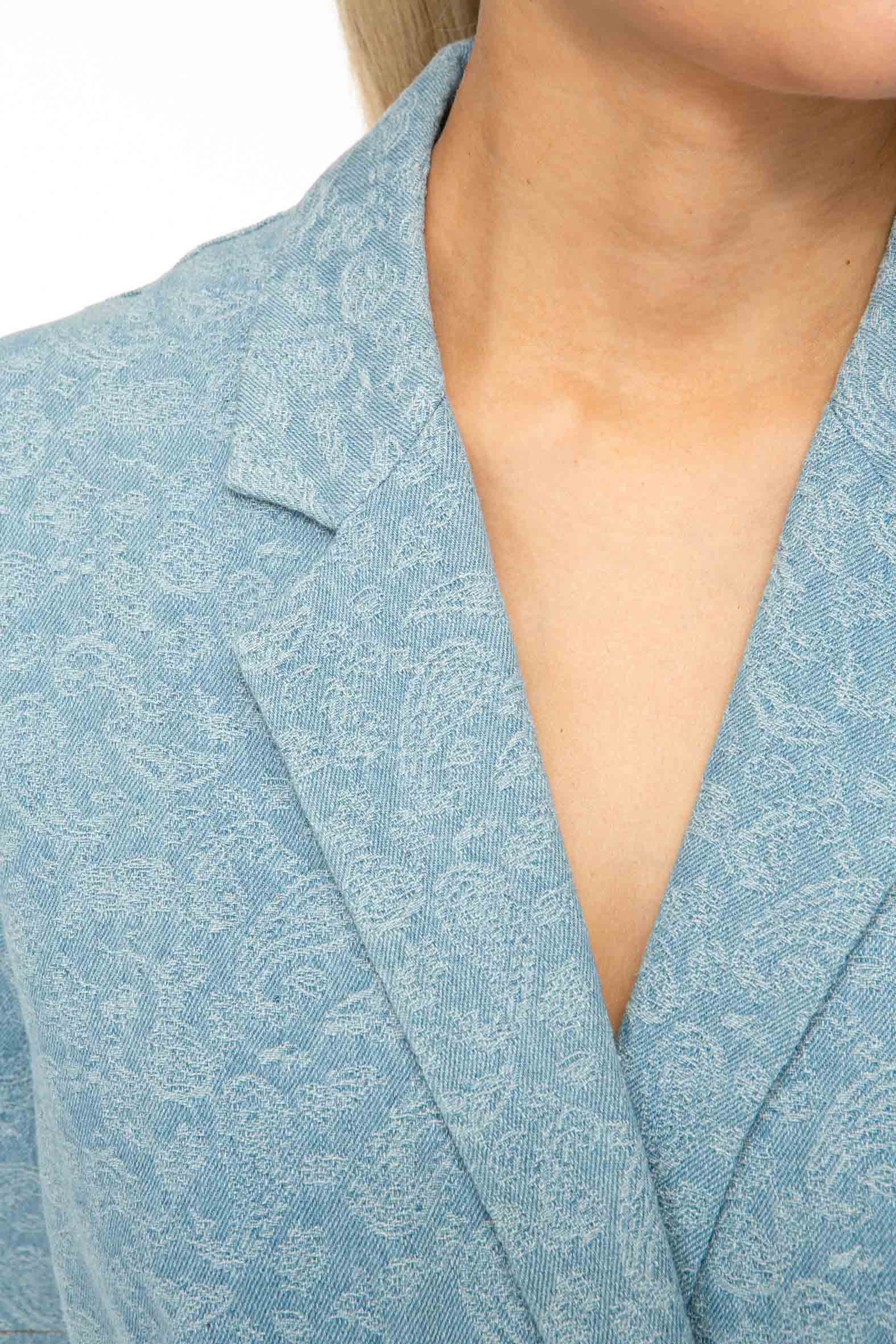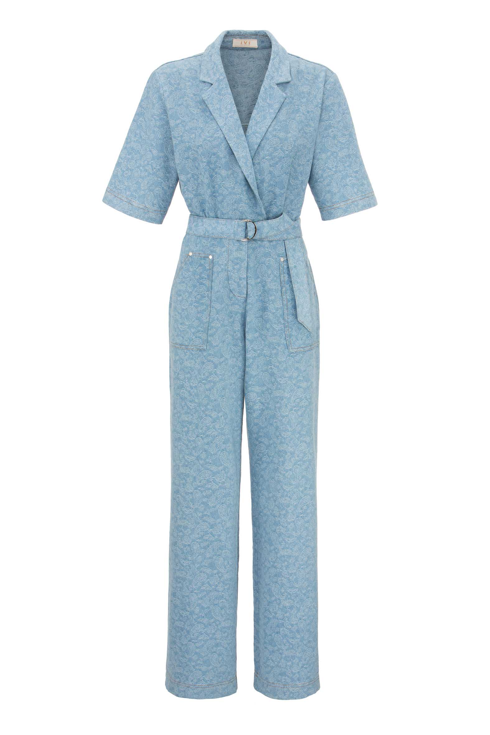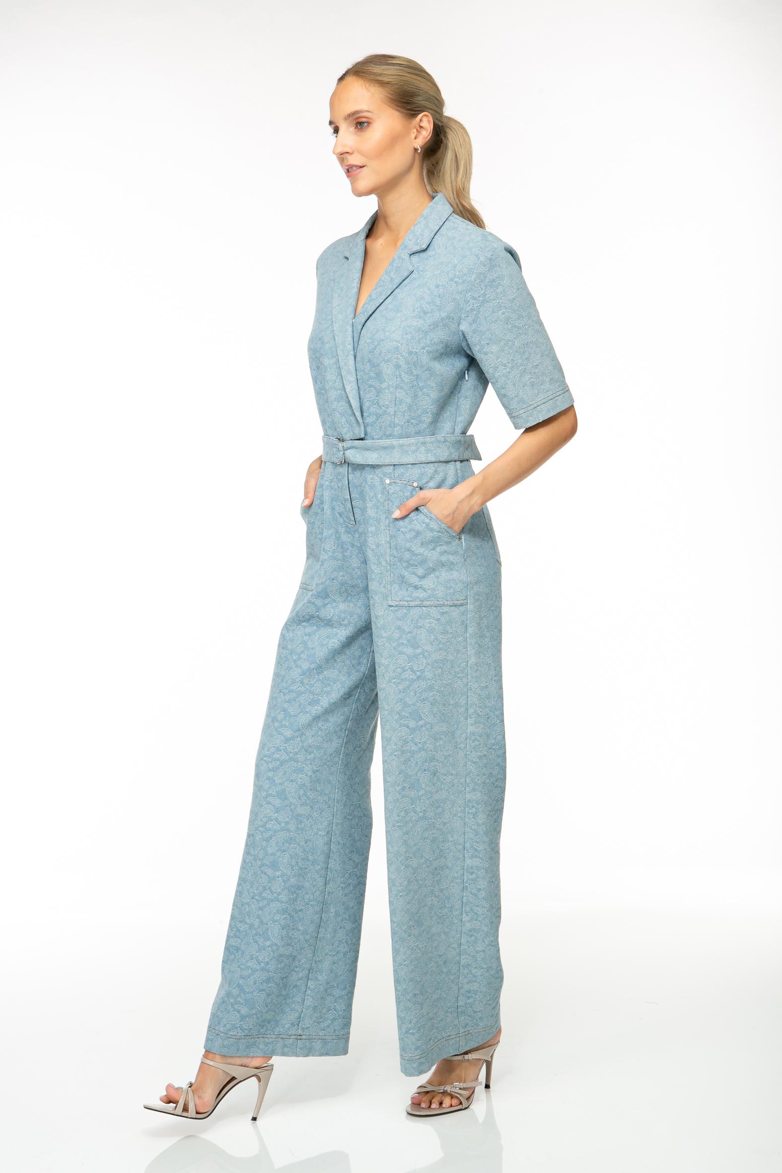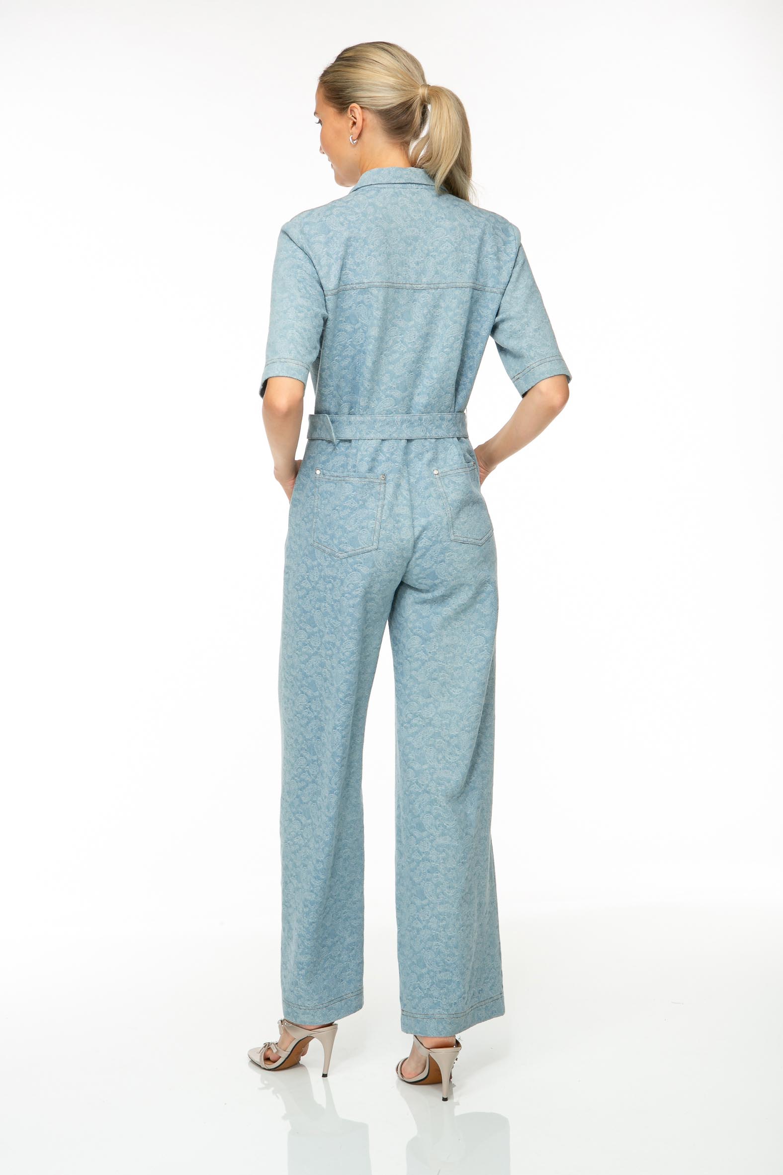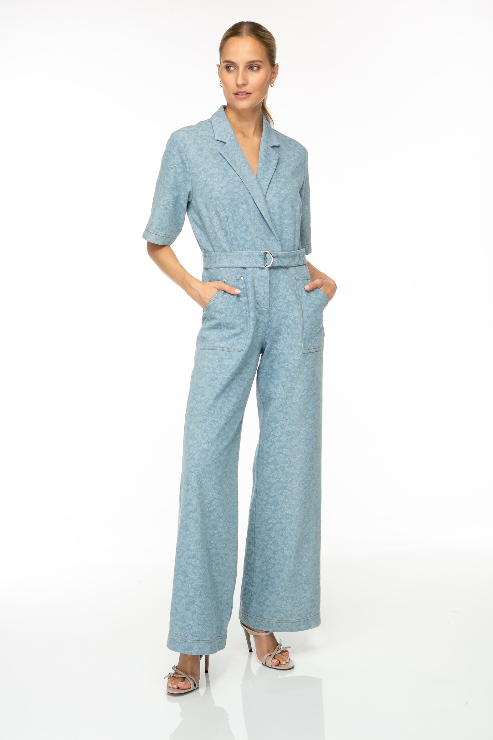Wrap-style jumpsuit in cotton denim with a paisley jacquard pattern.