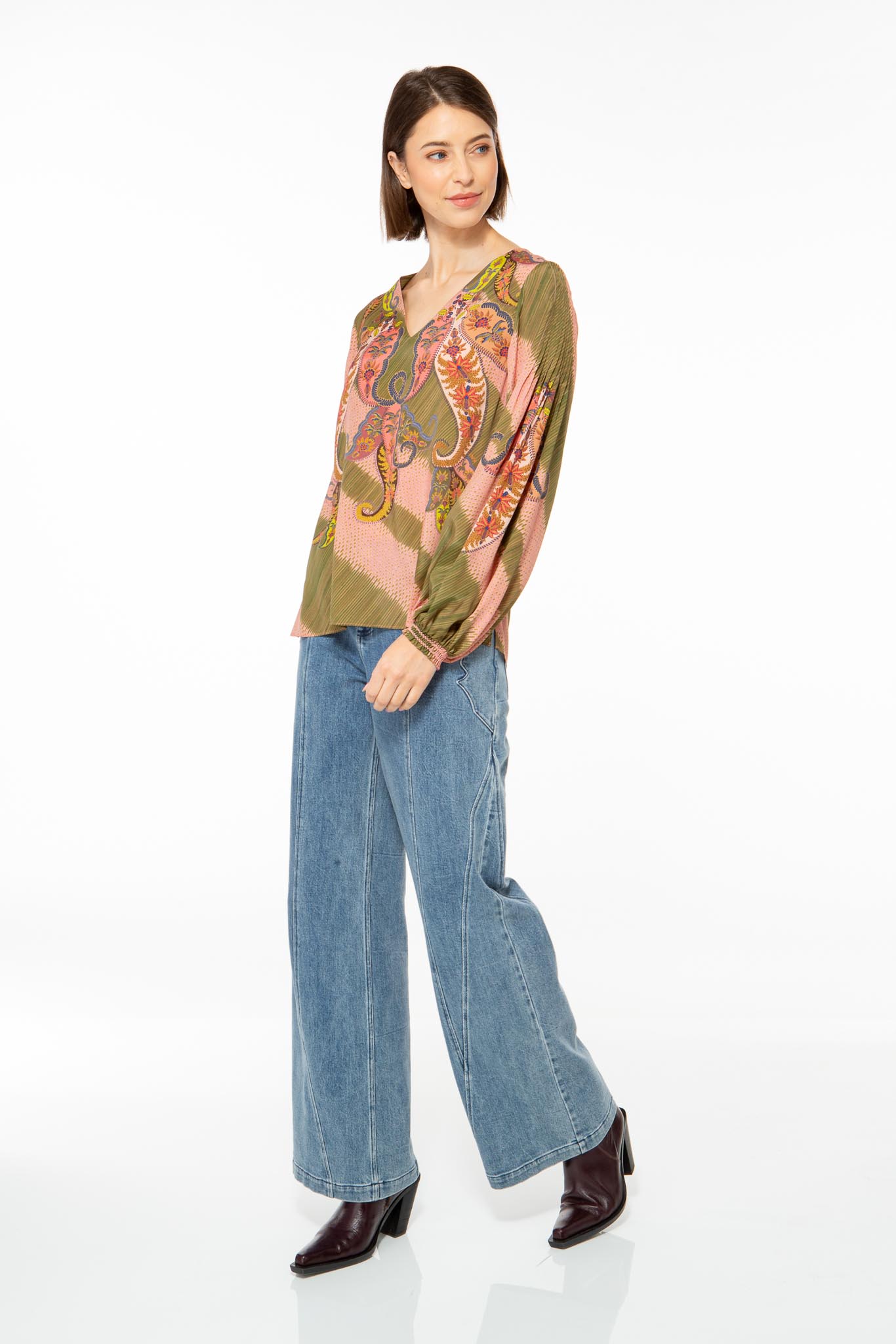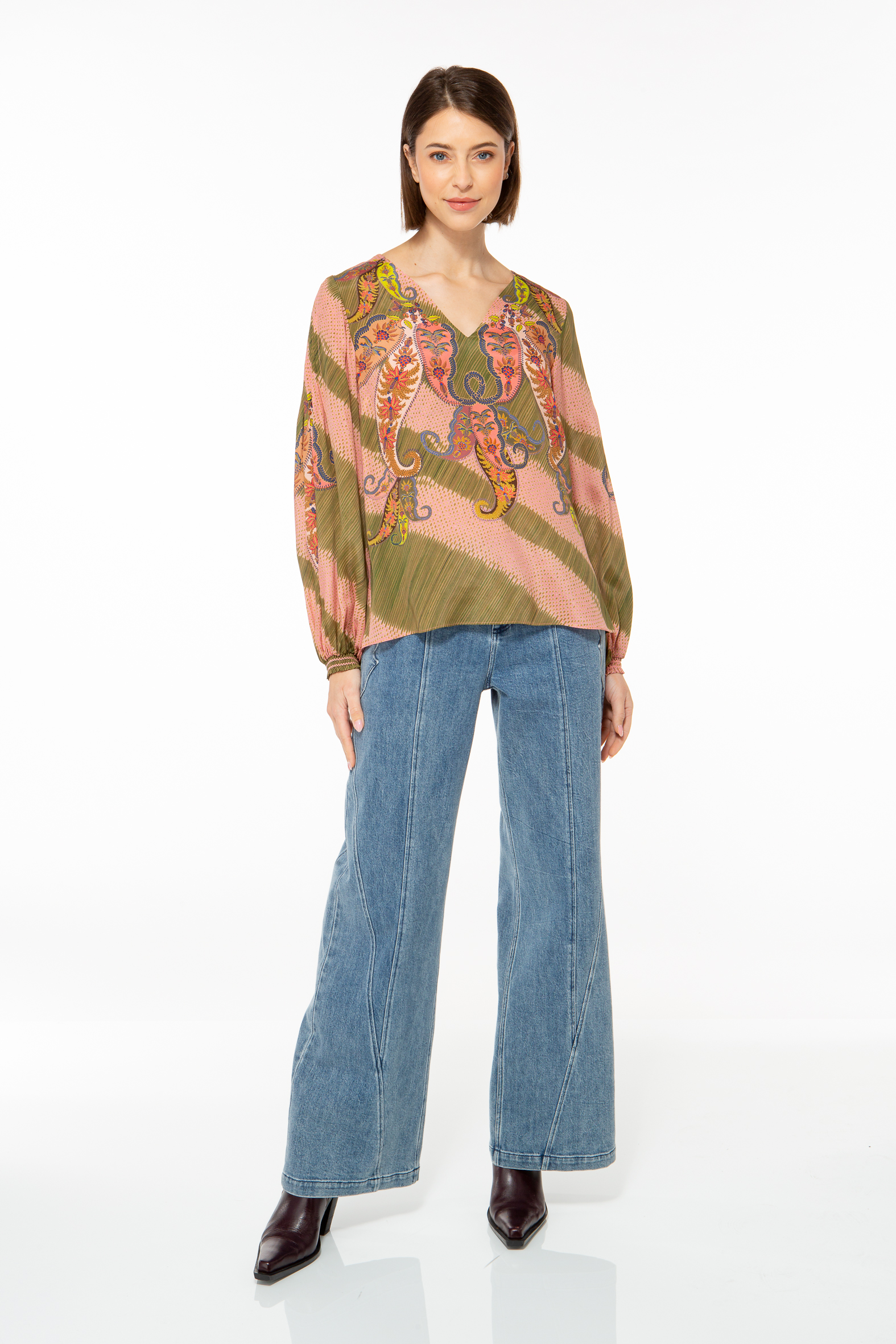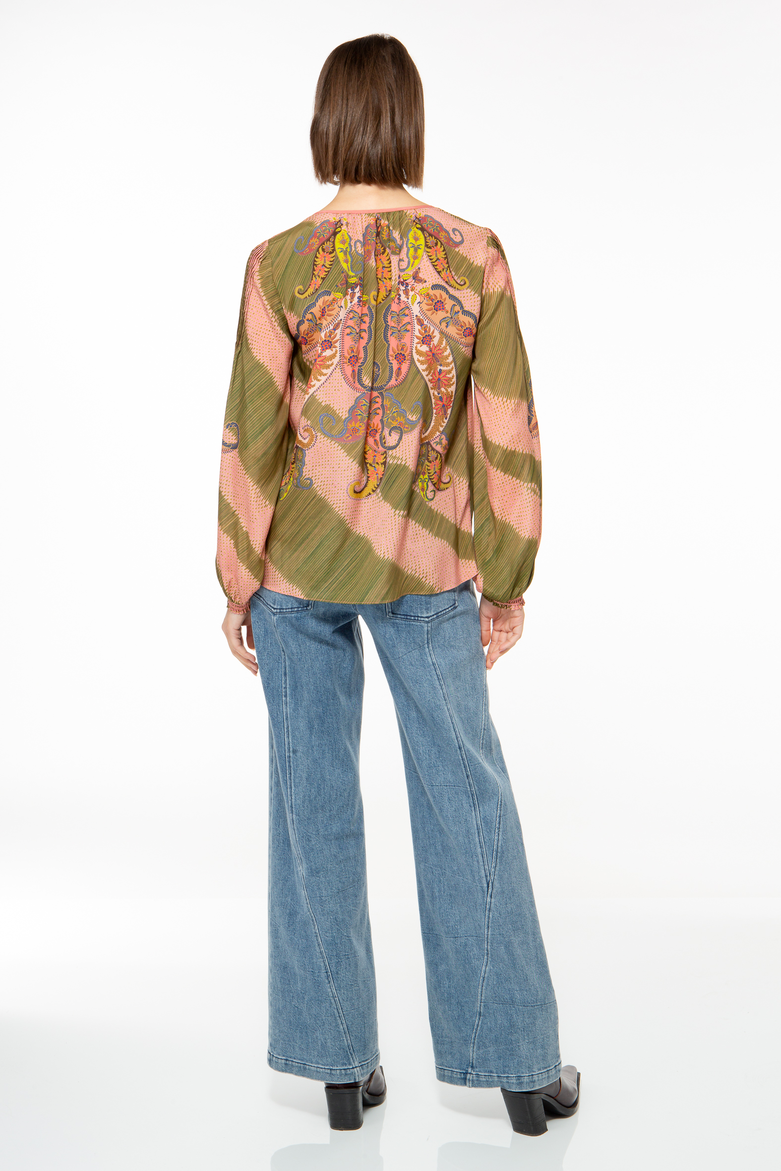 Feminine blouse made from a high-quality viscose and silk blend with a detailed paisley pattern.