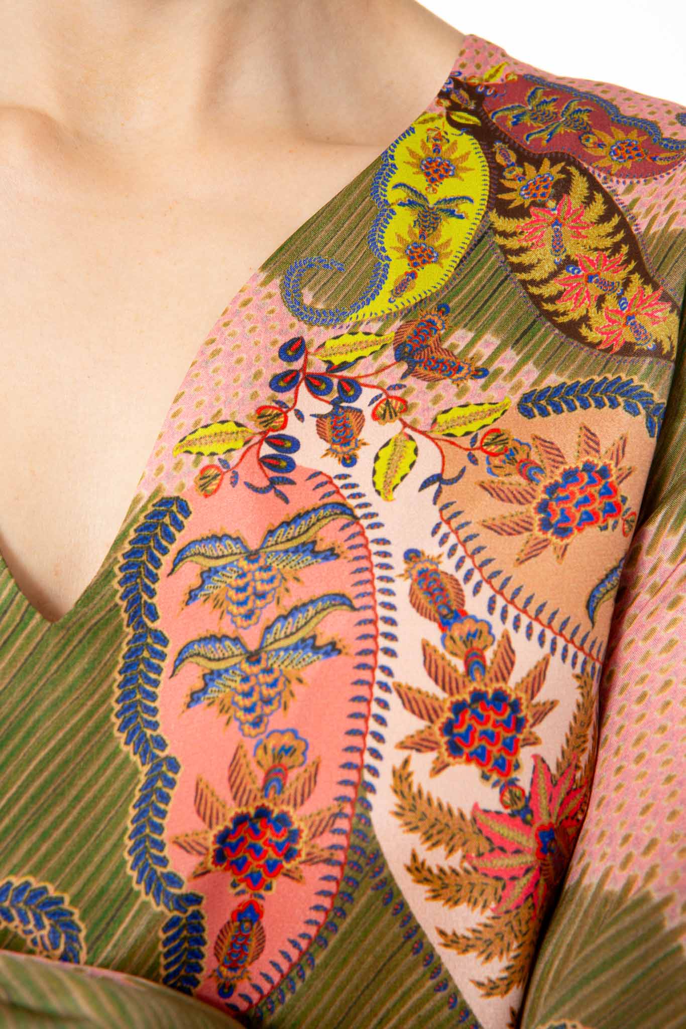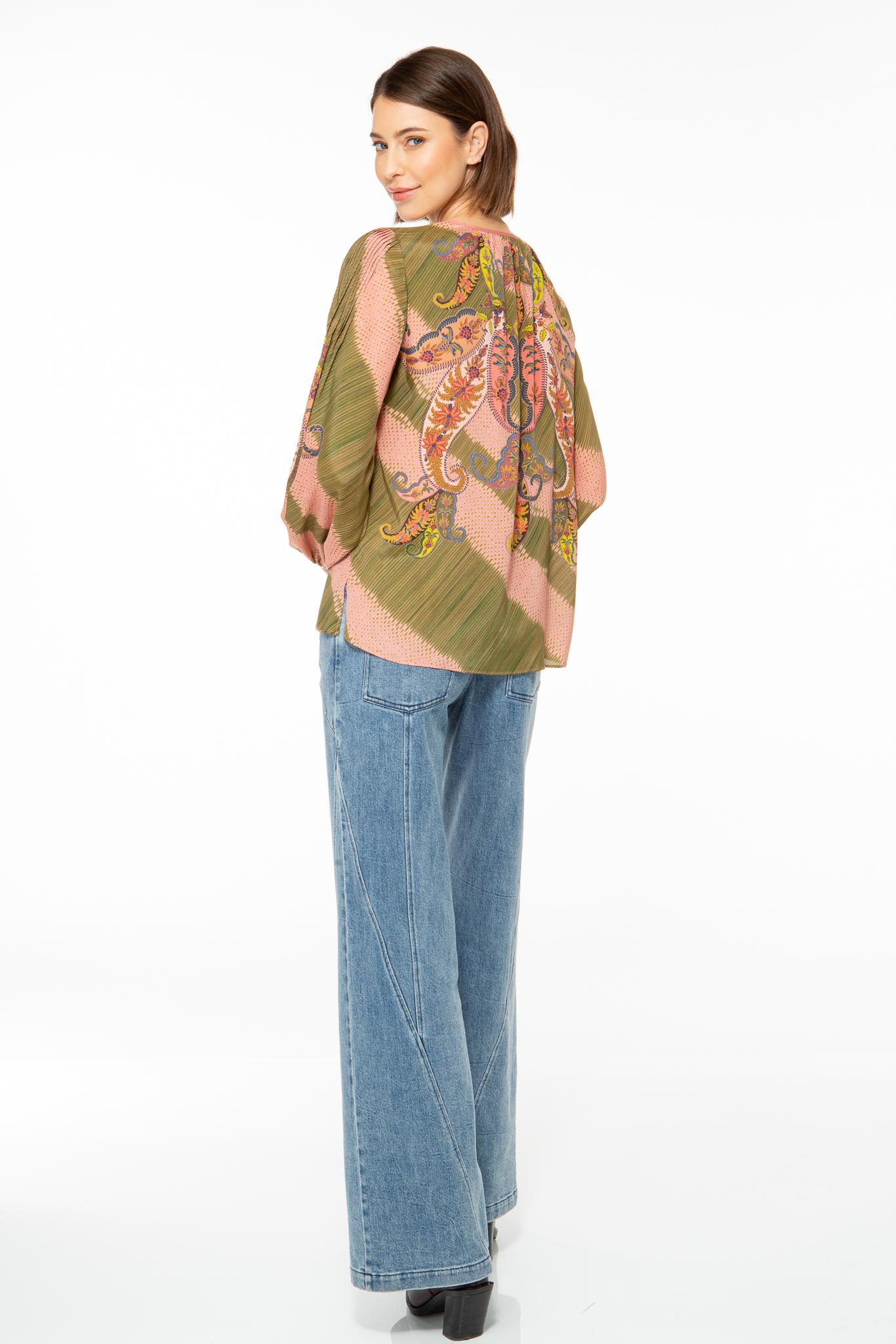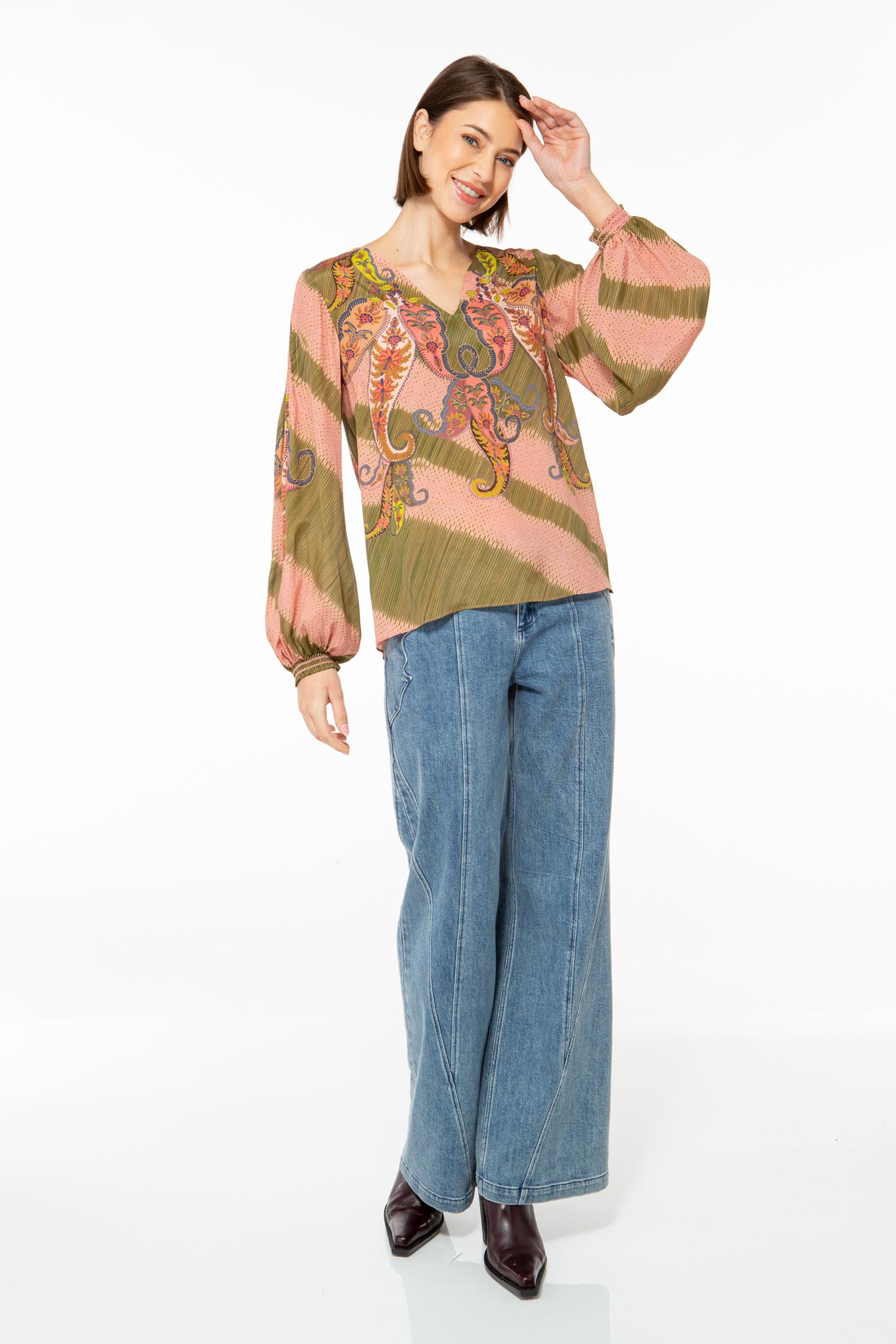 Feminine blouse made from a high-quality viscose and silk blend with a detailed paisley pattern.