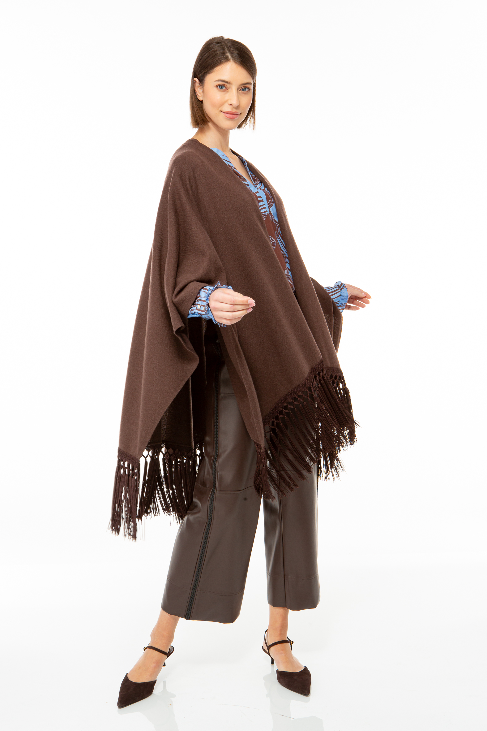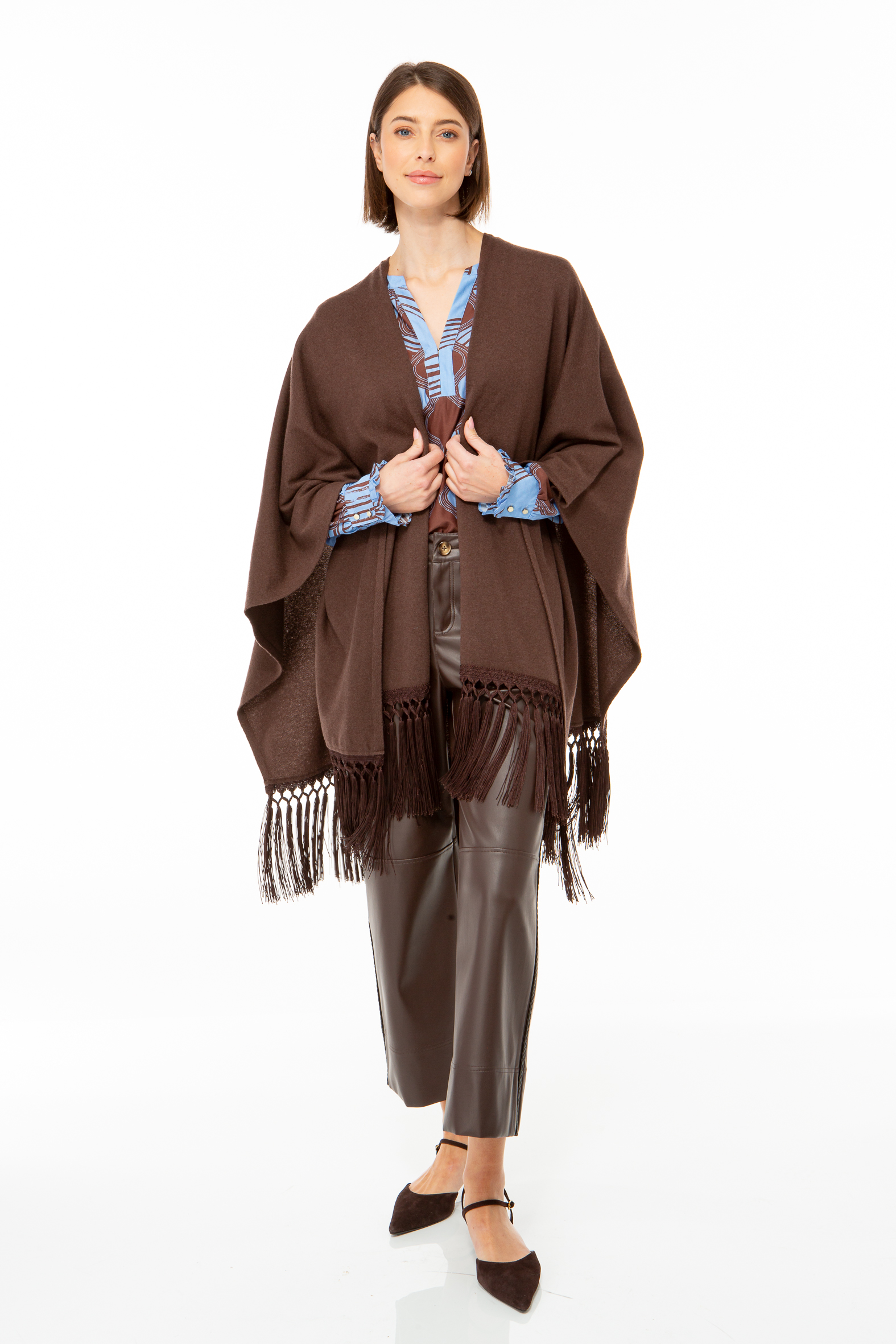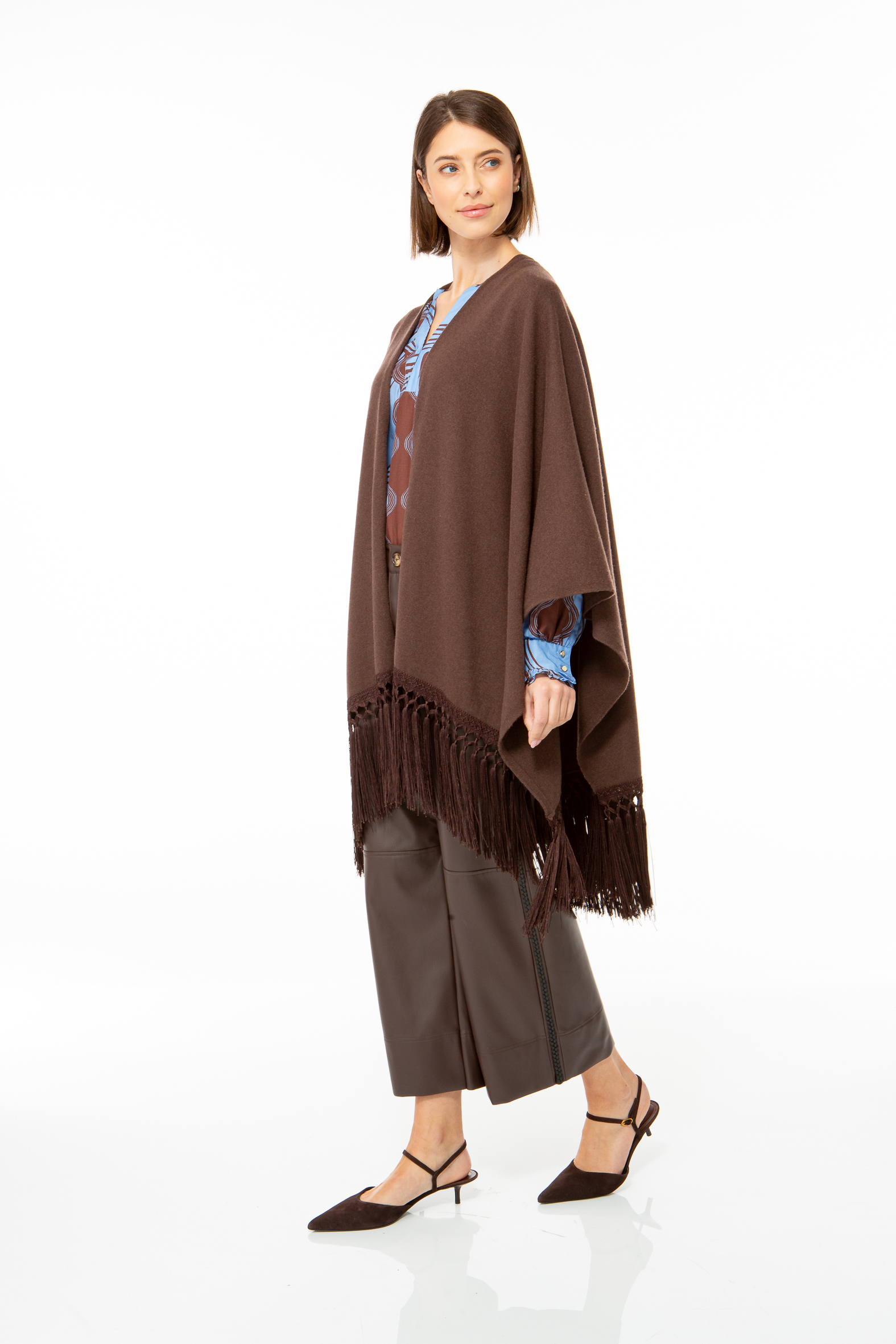 Casual cape made of soft merino knitwear with an elegant fringed border at the hem.