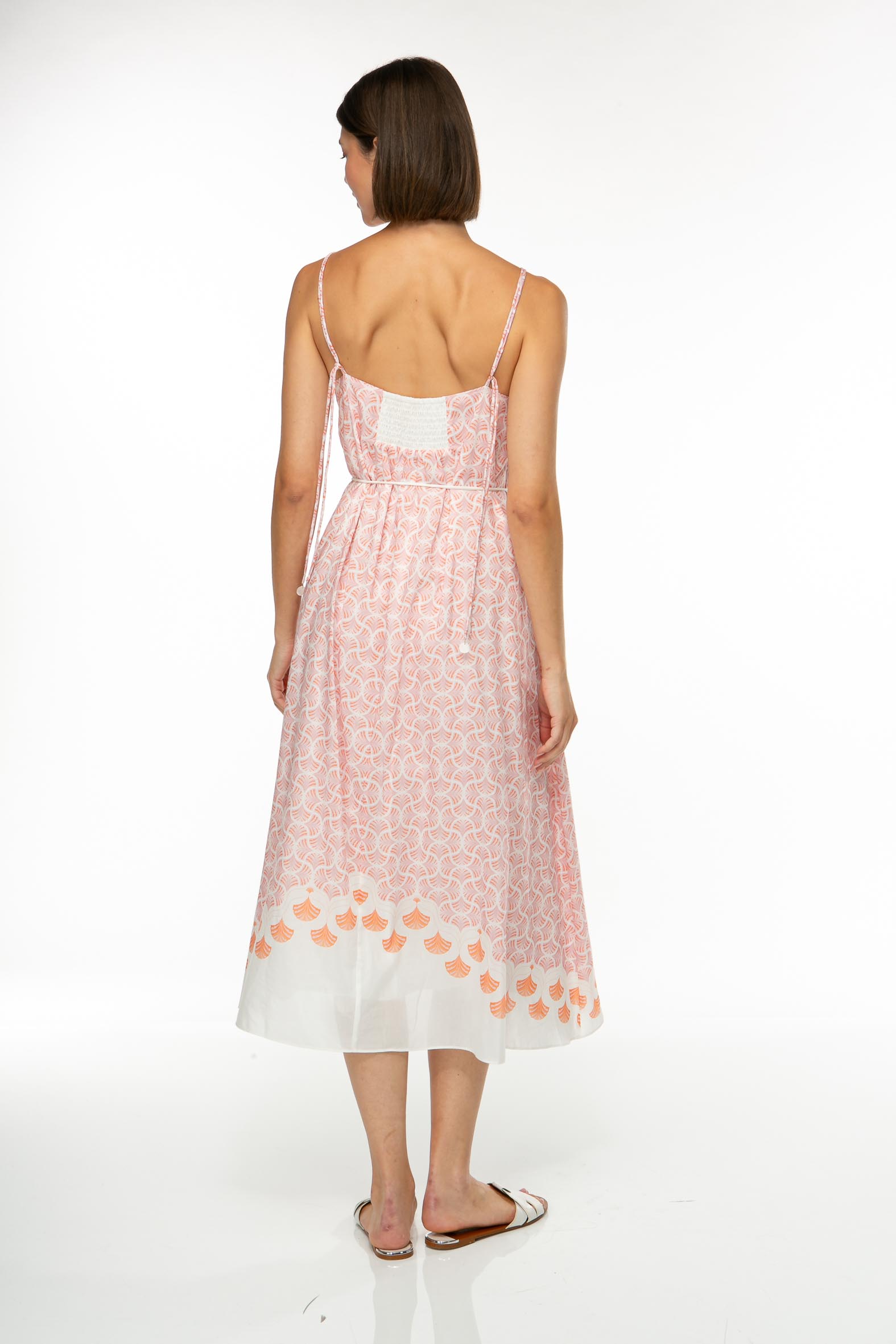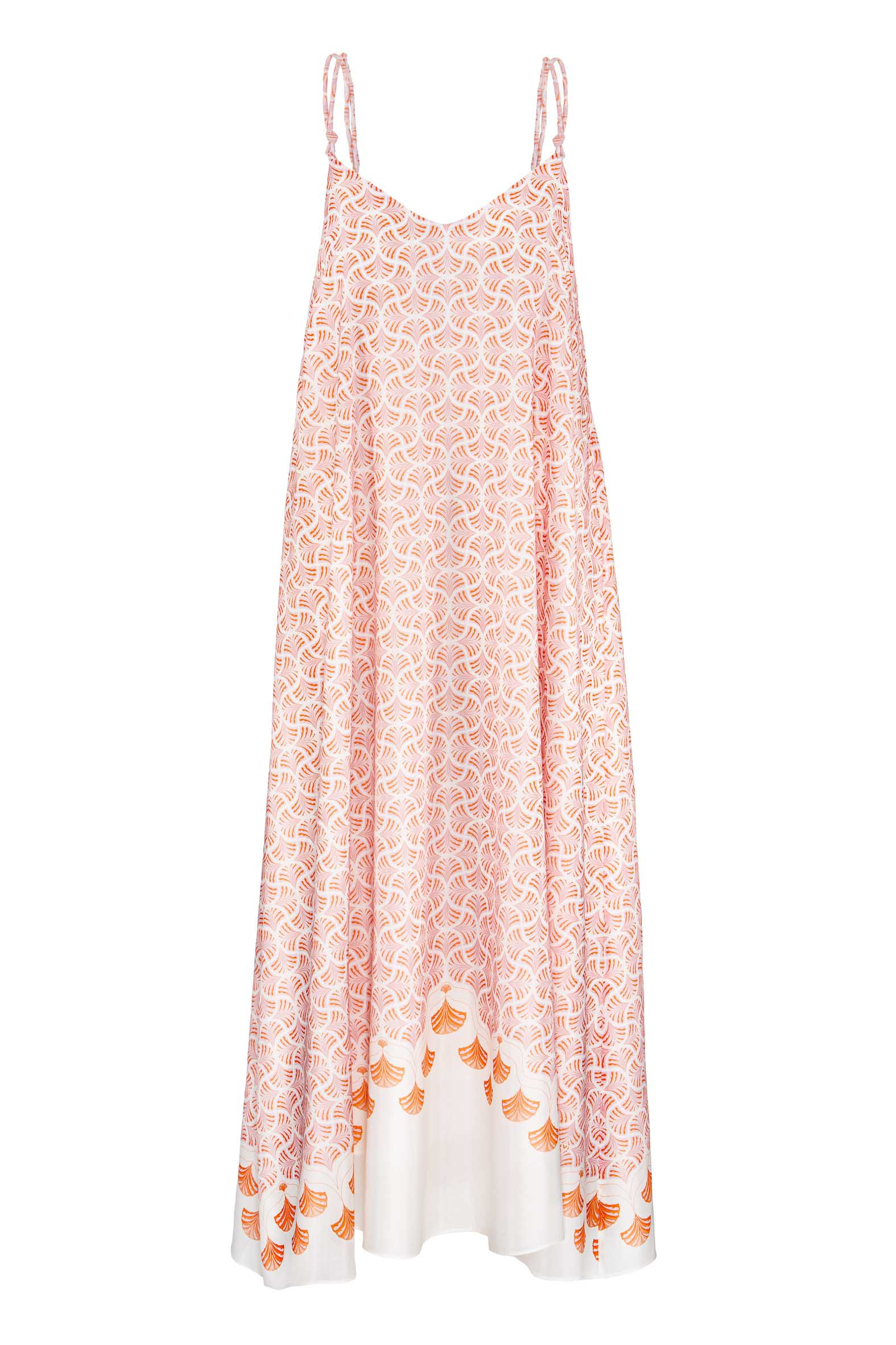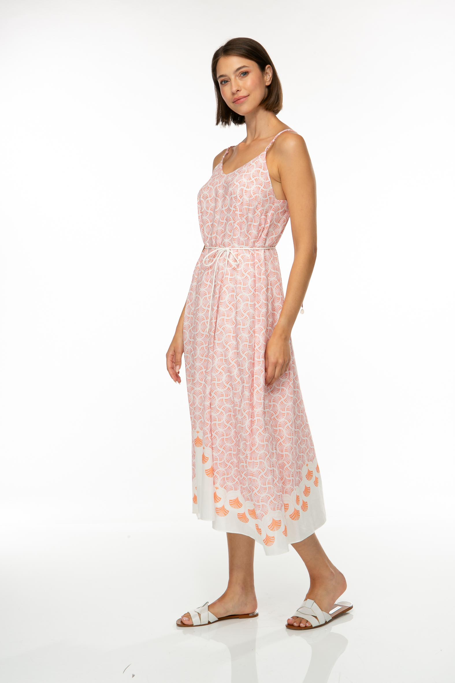 Midilanges Kleid mit justierbaren Spaghettiträgern aus feiner Baumwolle mit Allover Print und abgestimmten Bordüren.