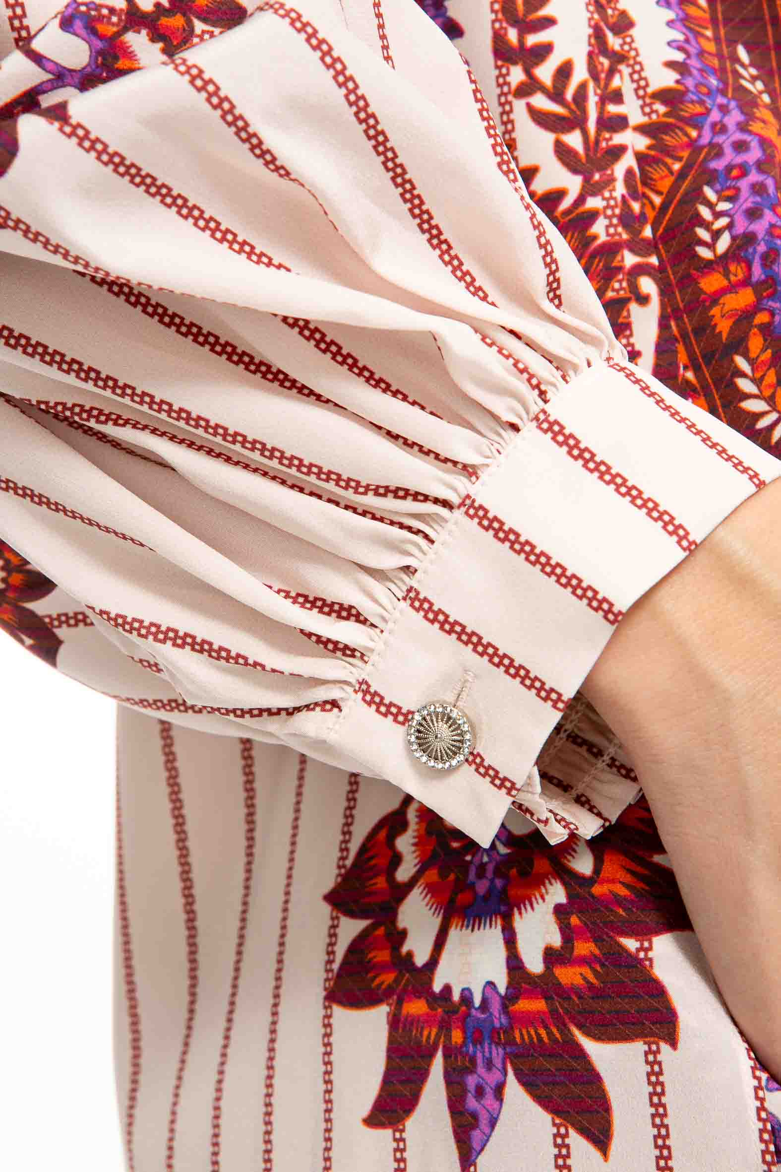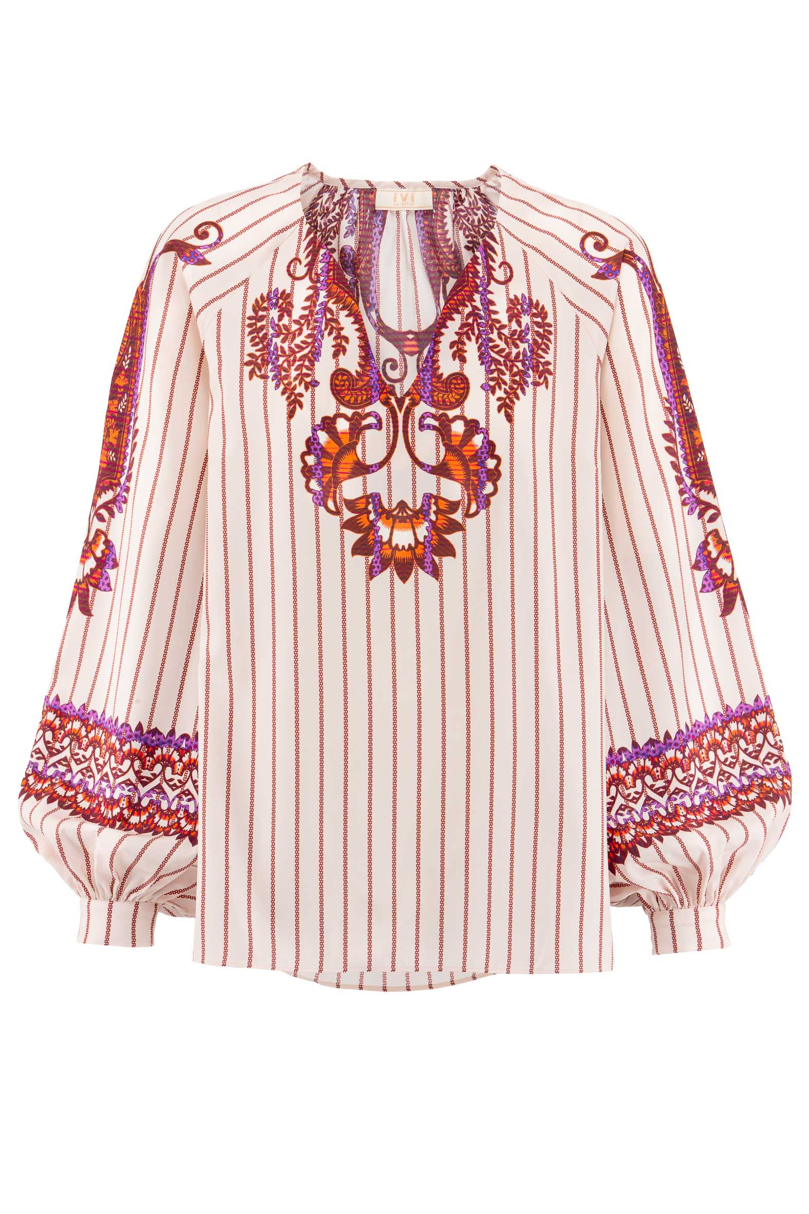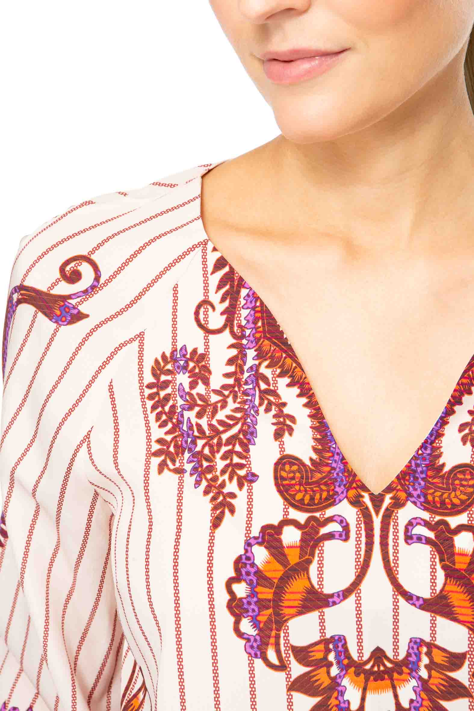 Feminine Bluse aus hochwertigem Seiden-Stretch mit gedrucktem Streifen und platzierten Ornamenten.