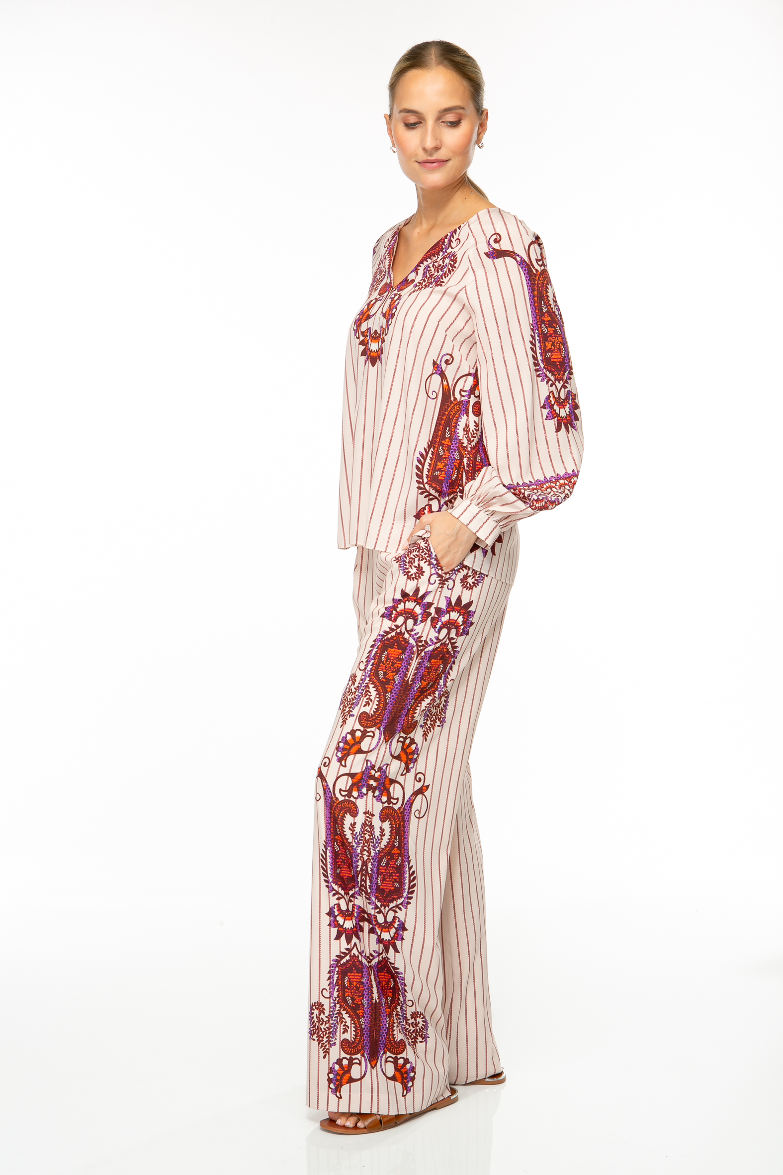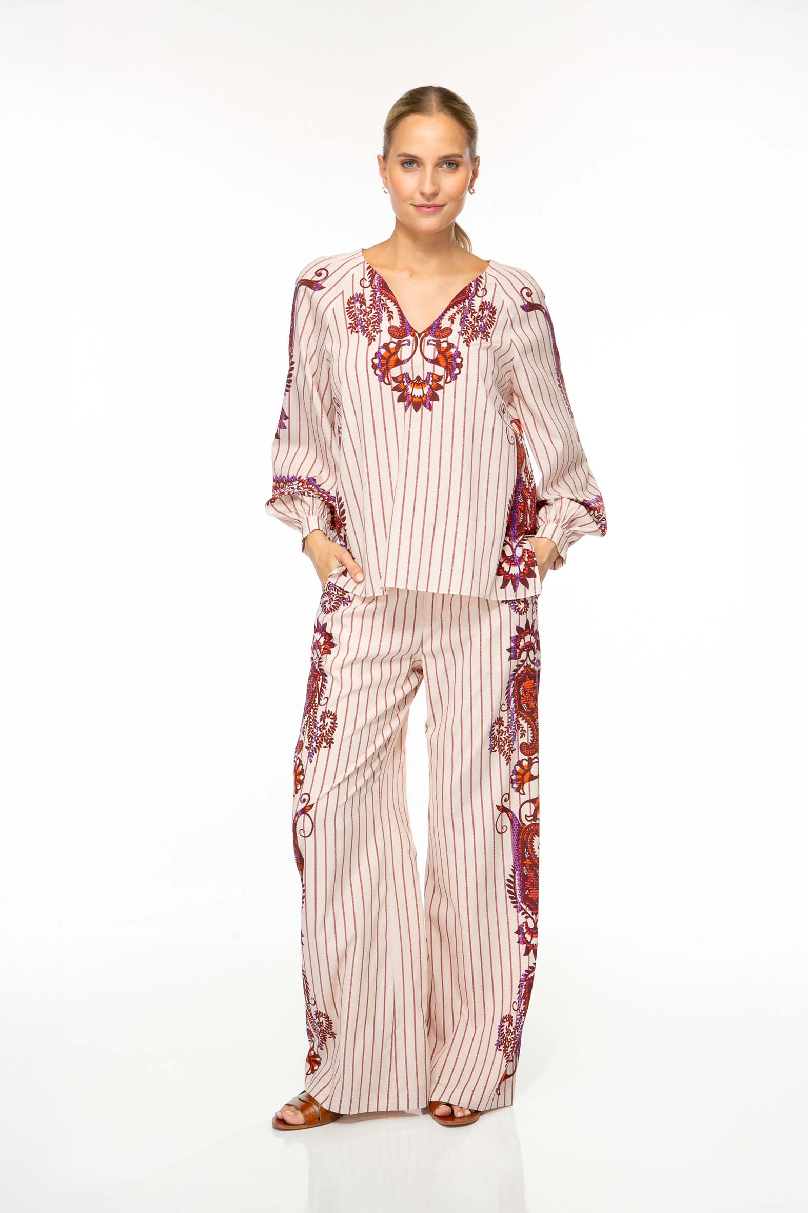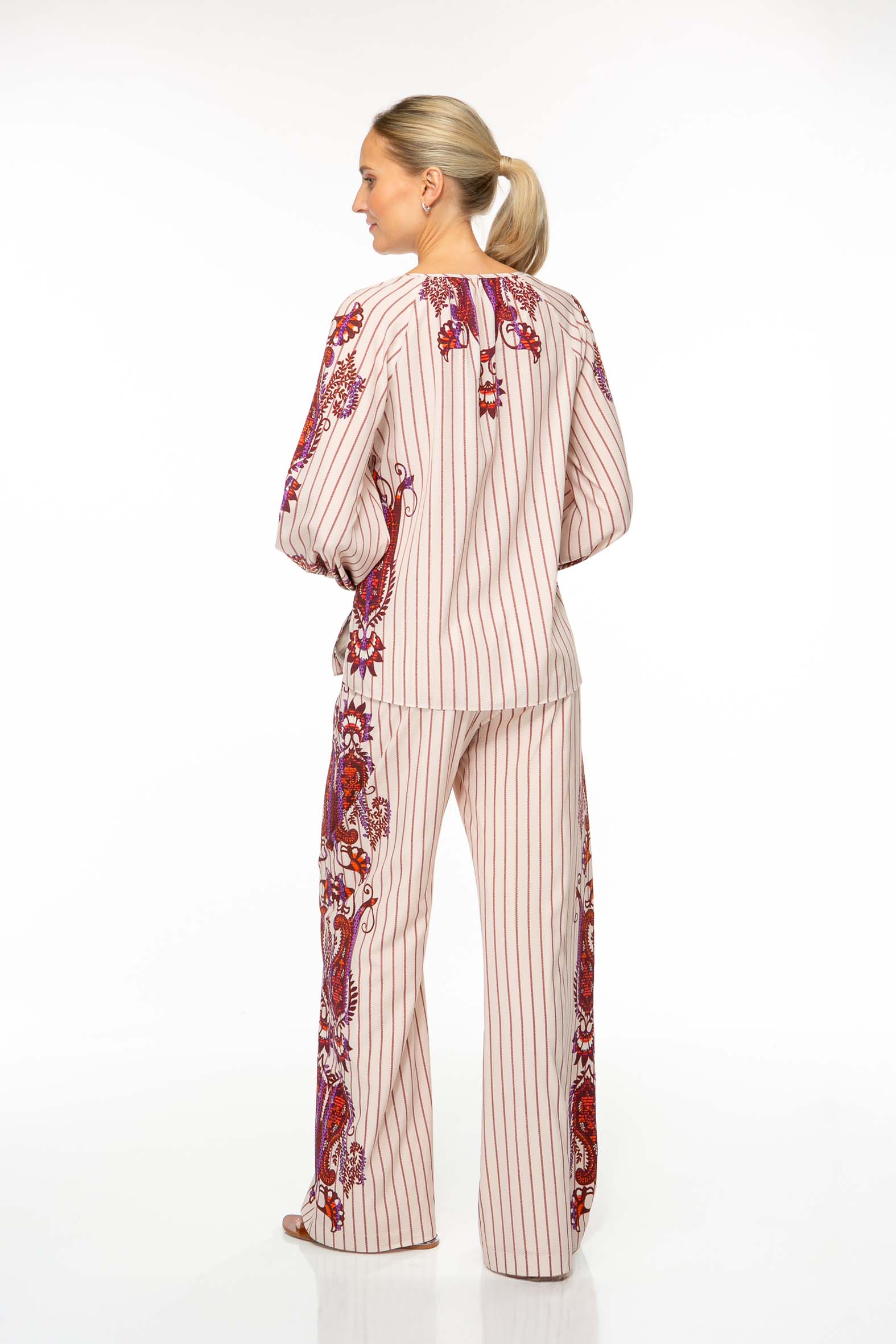 Feminine Bluse aus hochwertigem Seiden-Stretch mit gedrucktem Streifen und platzierten Ornamenten.