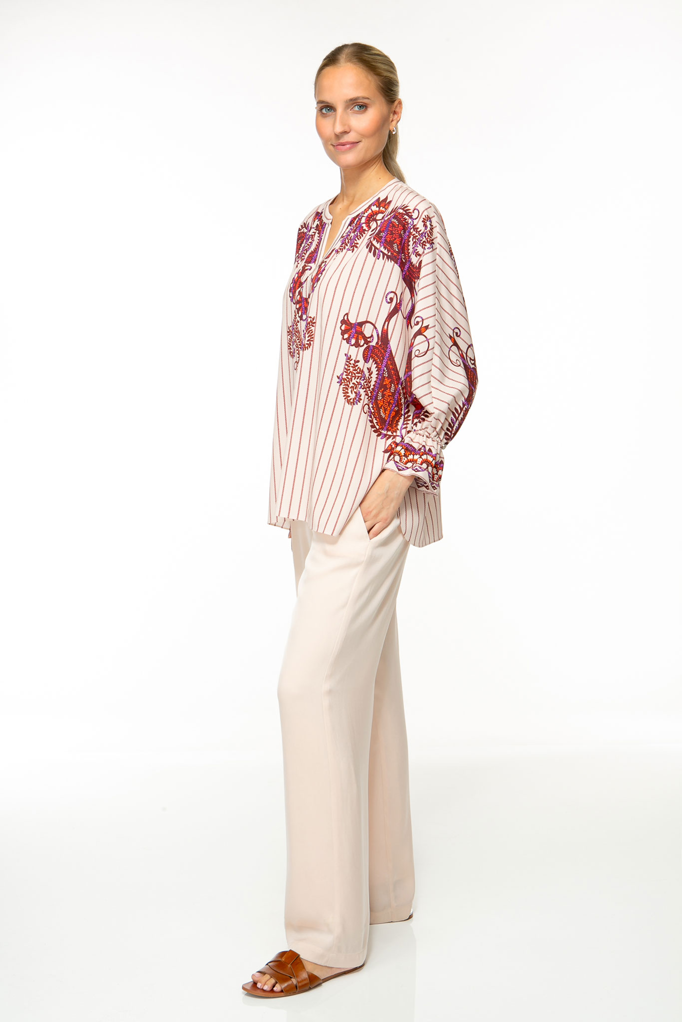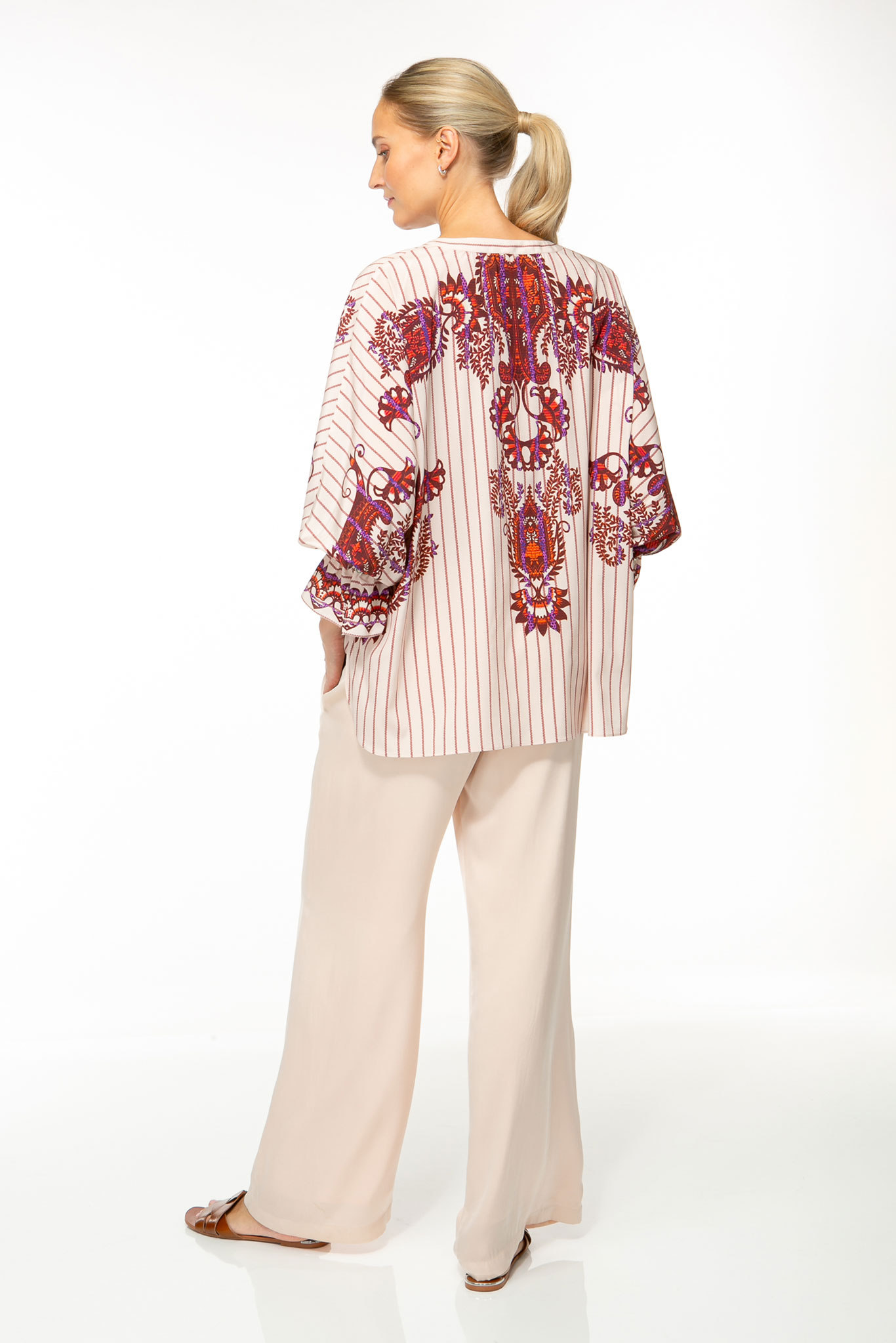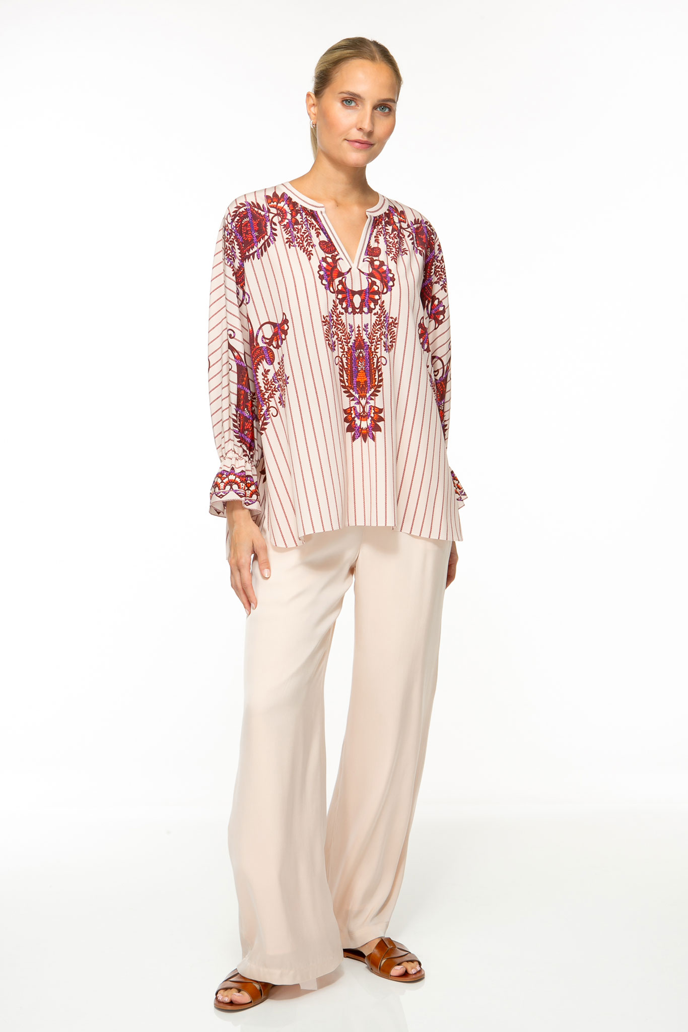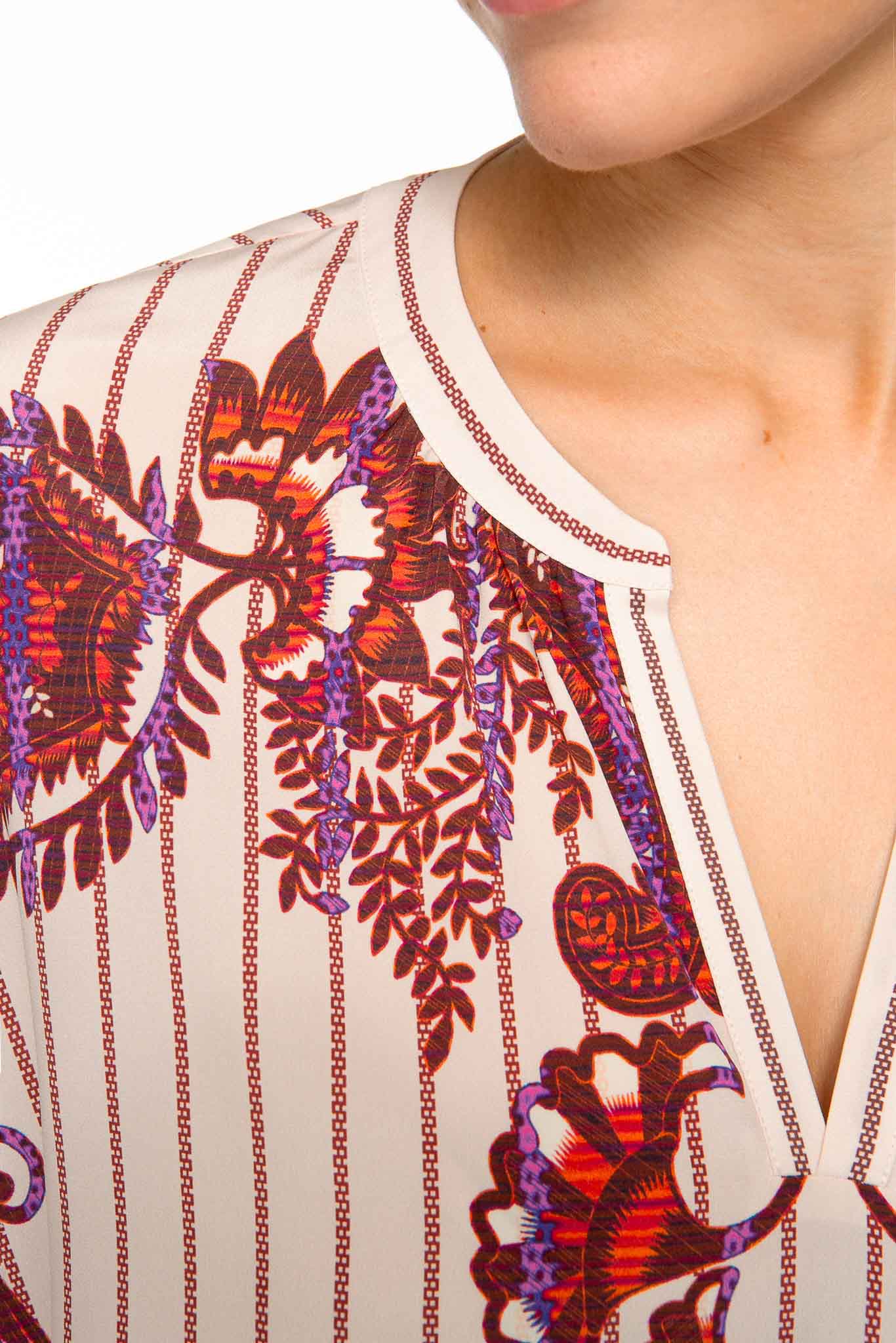 Der symmetrisch platzierte Print mit feinen Details und edler Farbgebung setzt in der weiten Silhouette eine formschöne Betonung.