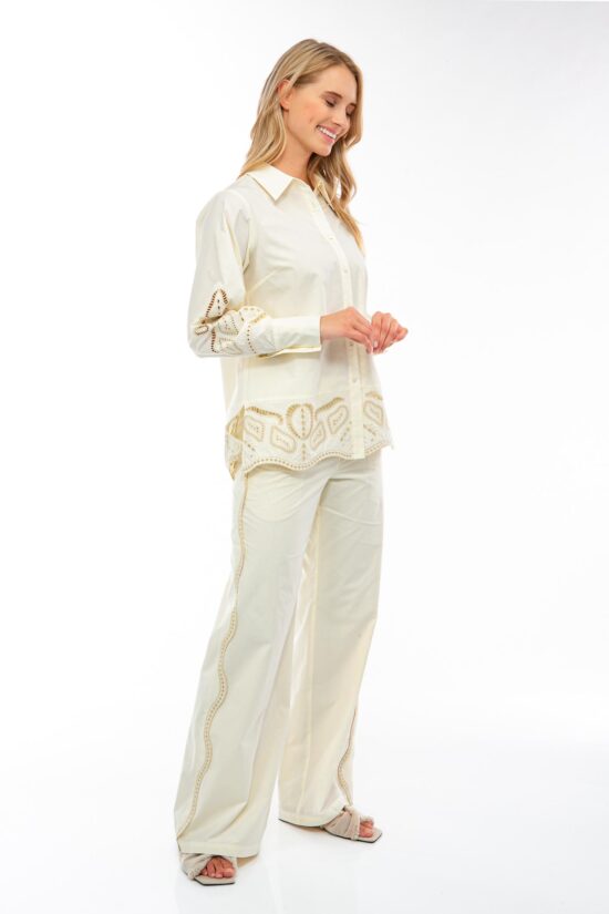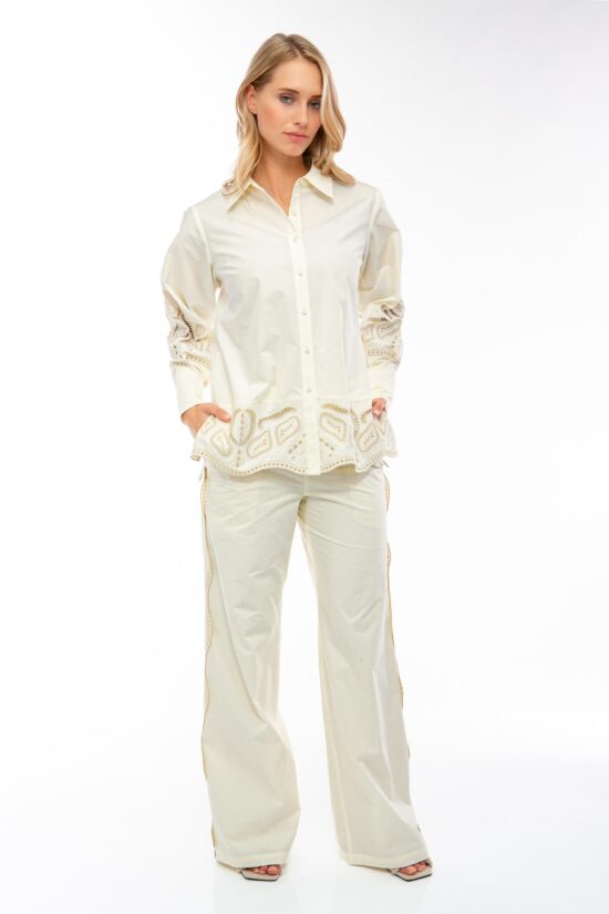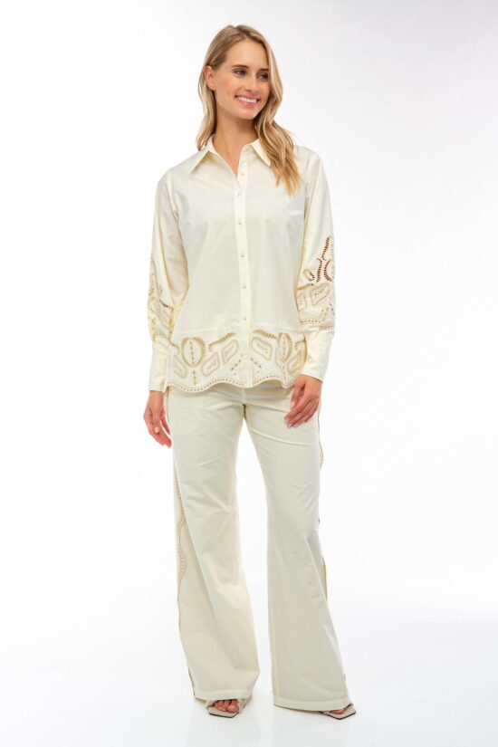 Hemdbluse aus feiner Baumwollqualität mit raffinierter Lochstickerei an Ärmeln, Saum und rückwärtiger Schulterpartie.