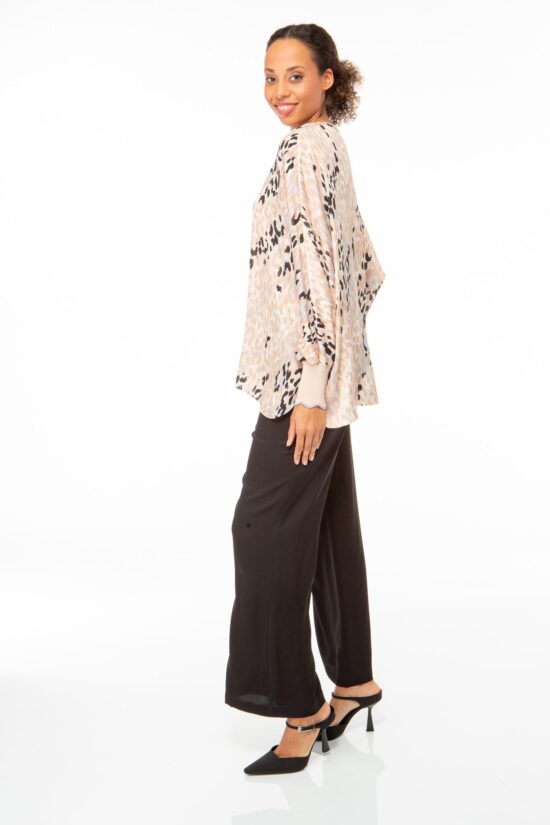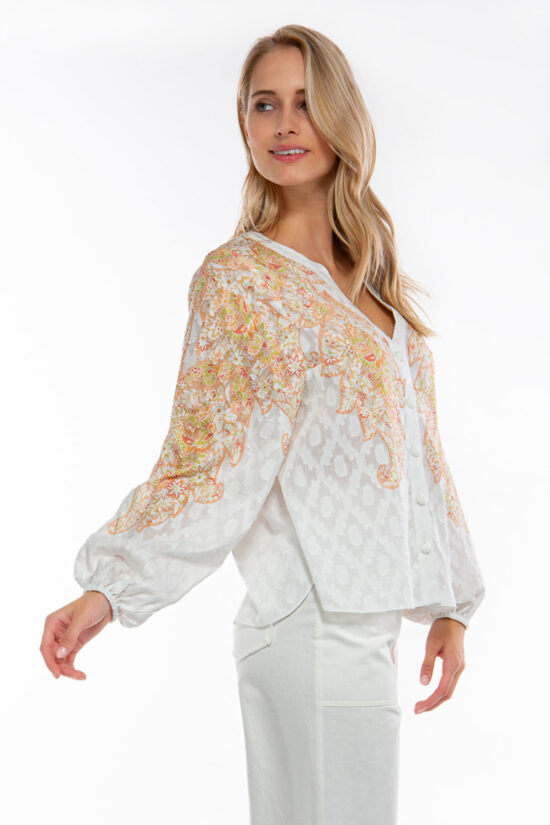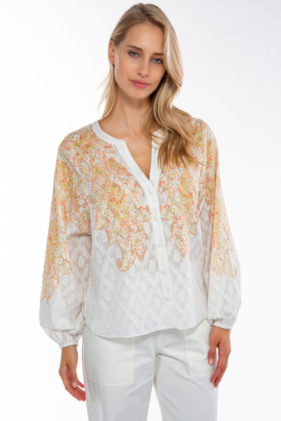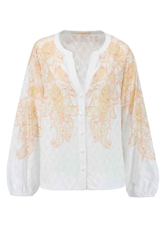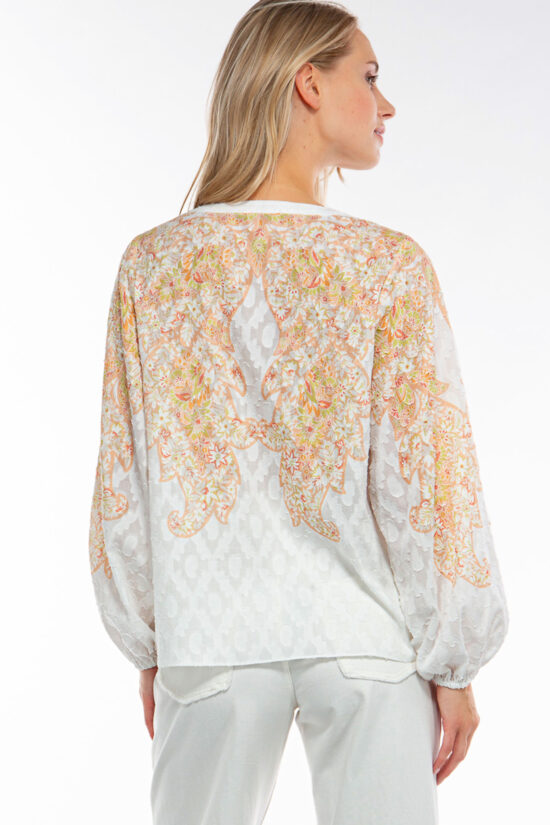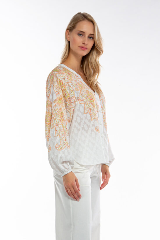 Feminine Bluse aus einem feinem Baumwoll-Seiden-Stoff mit graphischem Placement Print.