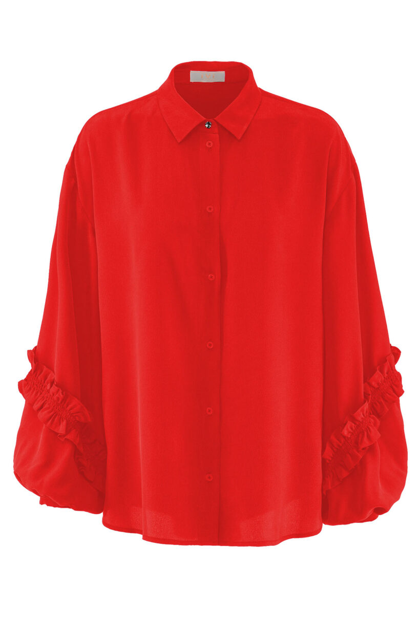 Die voluminösen Ärmel mit aufgesetzter Rüsche verleihen ein feminines Finish.