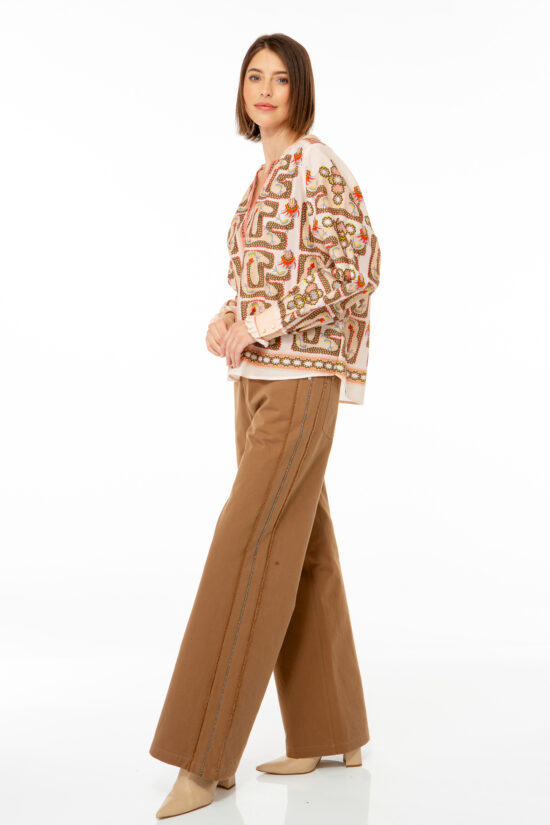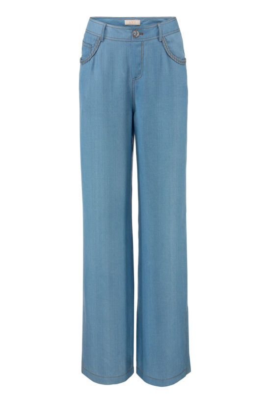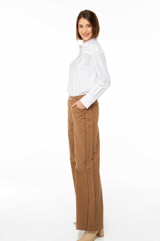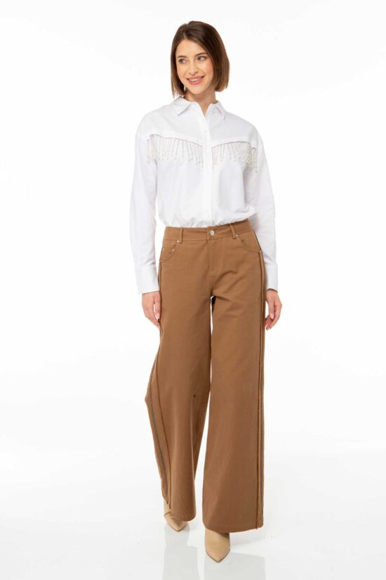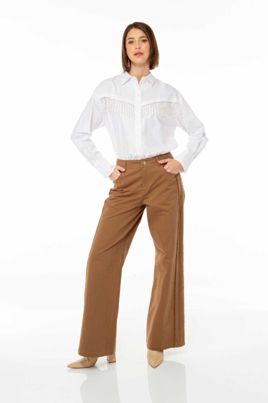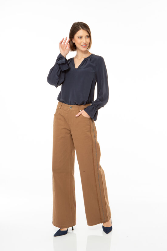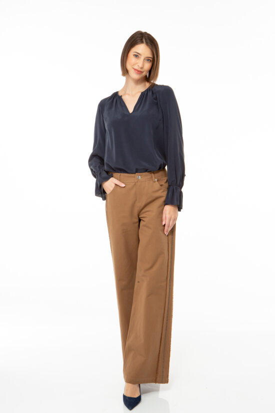 Der seitlich eingesetzte Streifen mit Fransenkante und Lurex-Zierlitze gibt dem Style ein edel lässiges Finish.