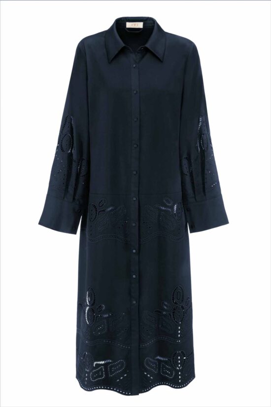 Weite Raglanärmel und Godets im schwingenden Rock verleihen einen lässig femininen Look. Der hohe Rundhalsausschnitt kann mit feinem Hakenverschluss kann nach Belieben offen oder geschlossen getragen werden