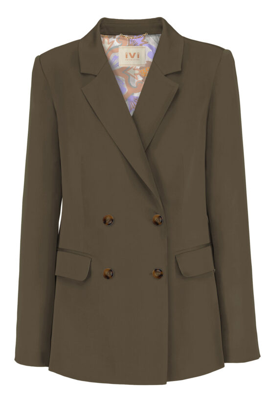 Der Blazer hat Hornlook Knöpfe, feine geflochtene Zierlitzen und einen Riegel im Rücken.