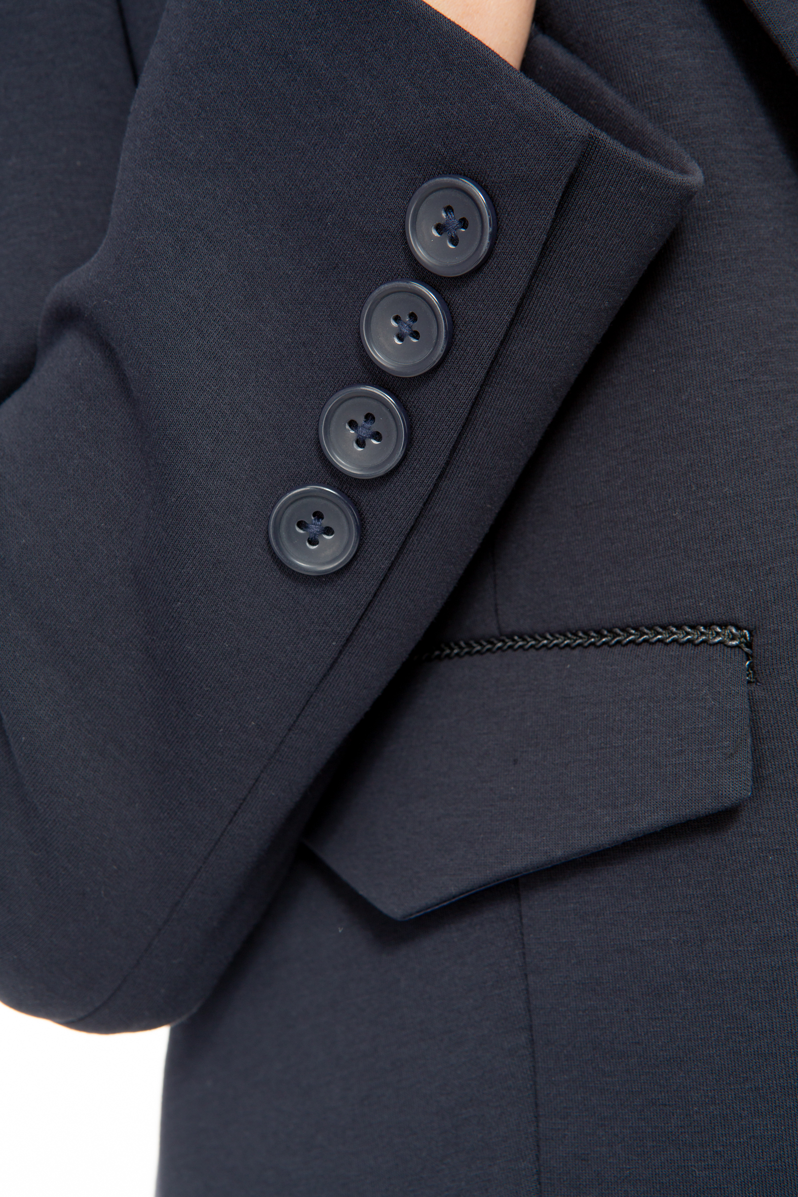 Der Blazer hat Hornlook Knöpfe, feine geflochtene Zierlitzen und einen Riegel im Rücken.