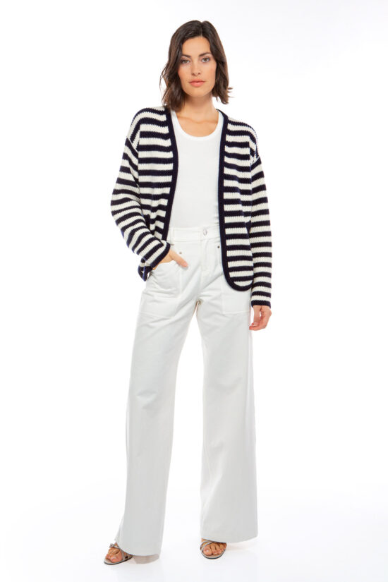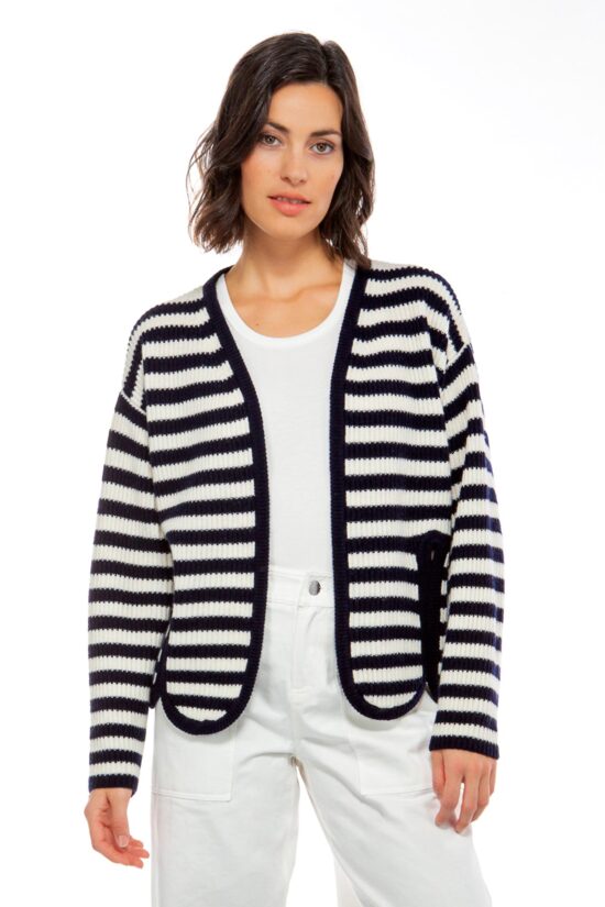 Verkürzter Cardigan im Struktur-Strick mit geripptem Schalkragen. Die mit Lurex durchwobene Perlen Applikation an den Ärmelbündchen verleiht einen Hauch von Luxus.