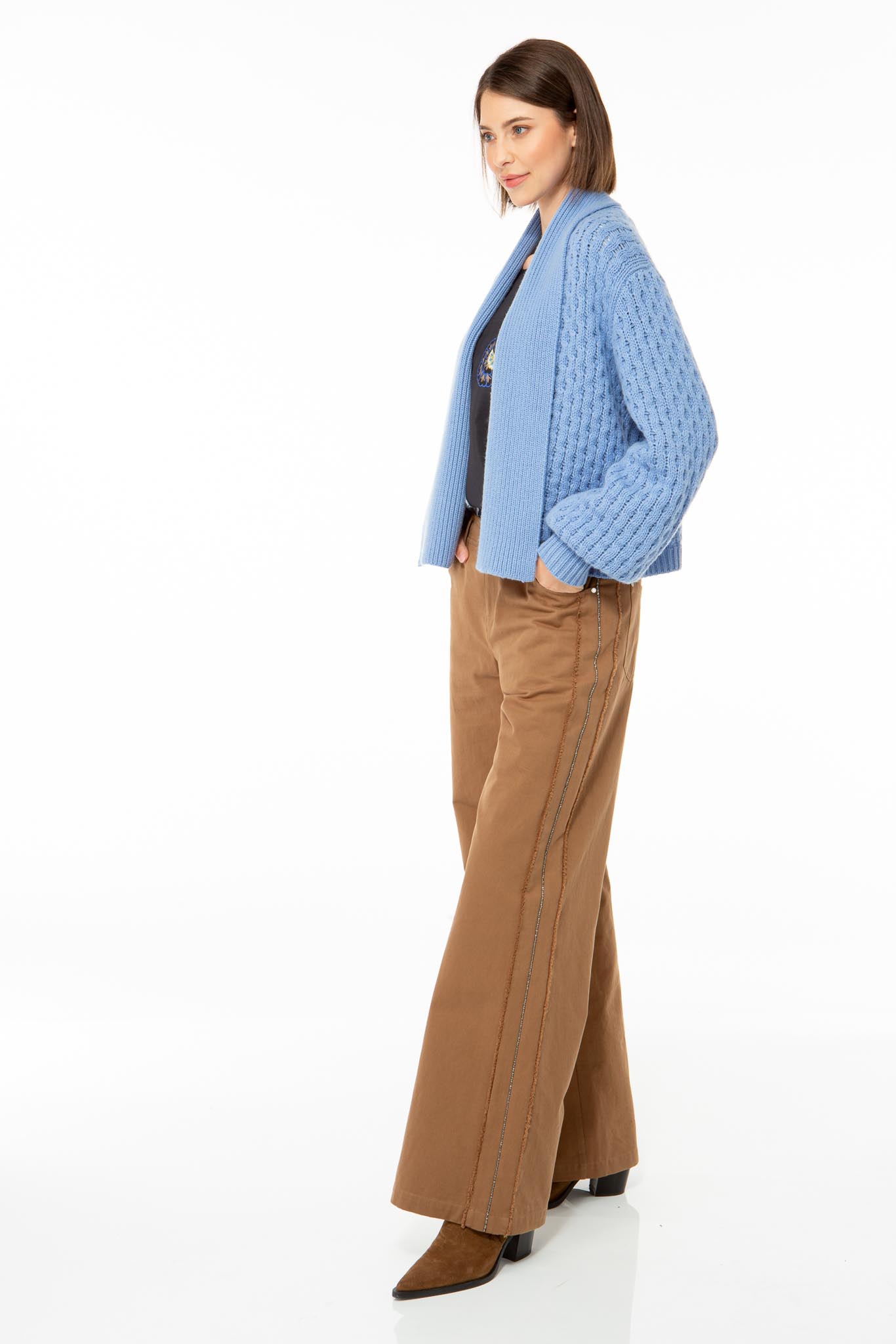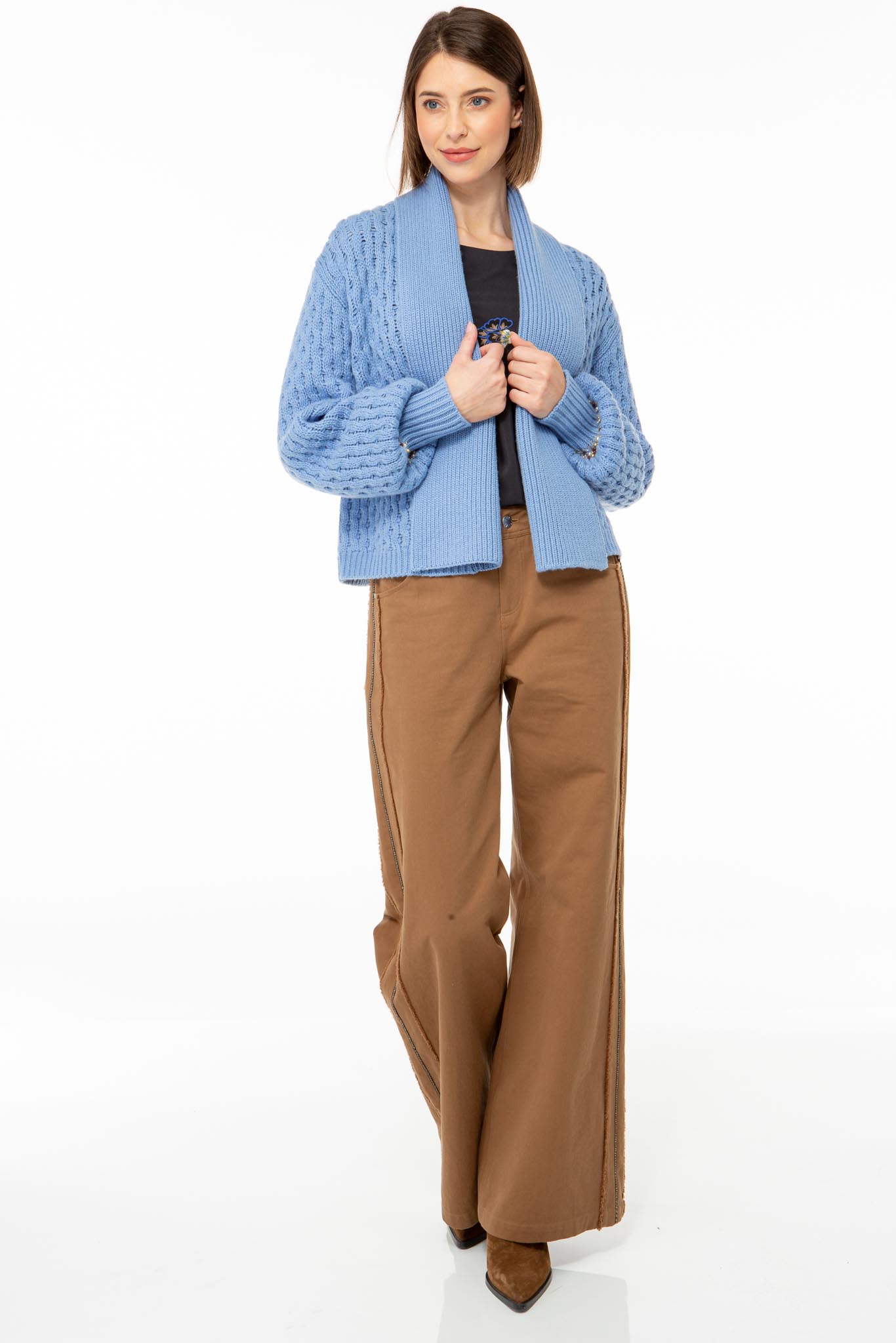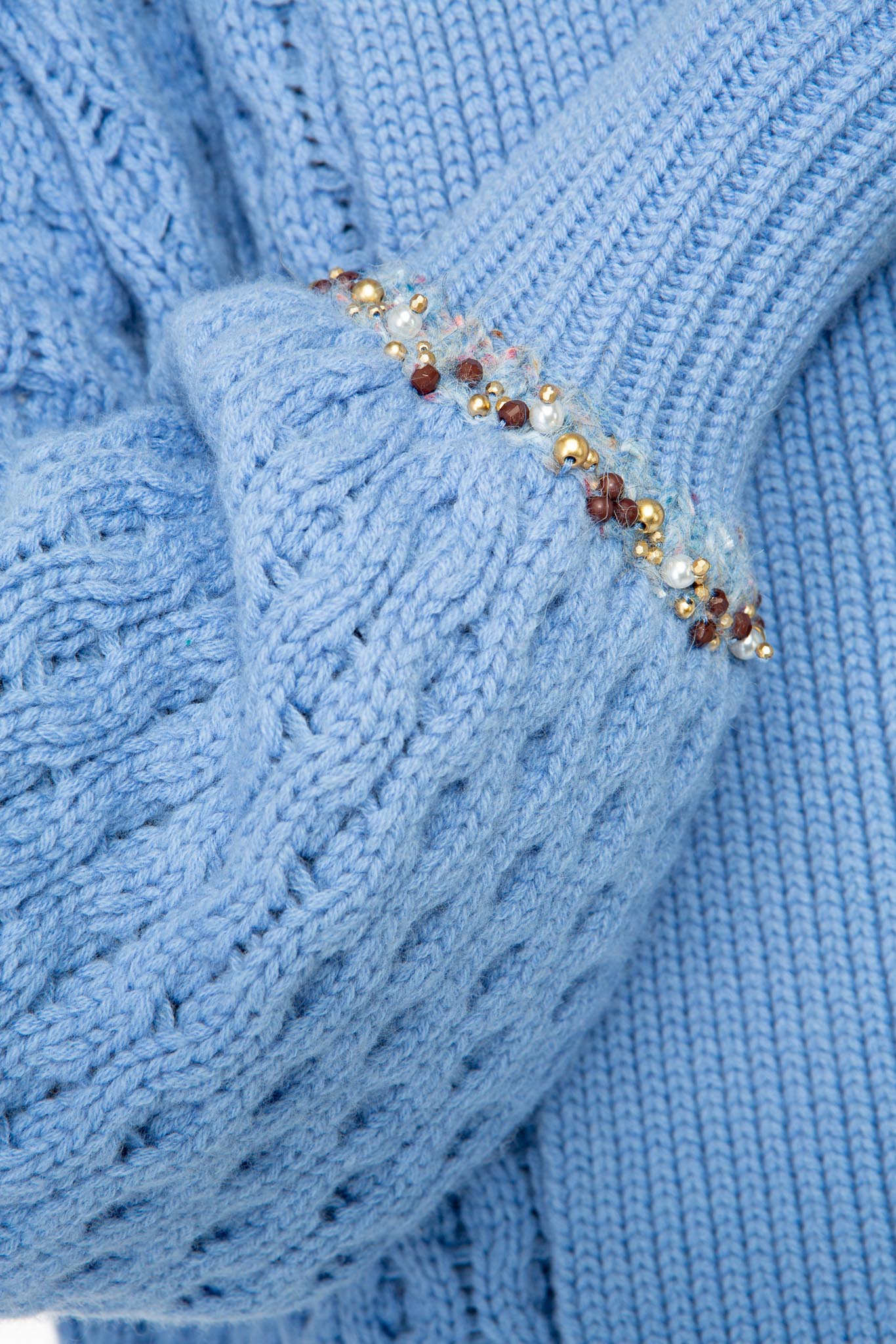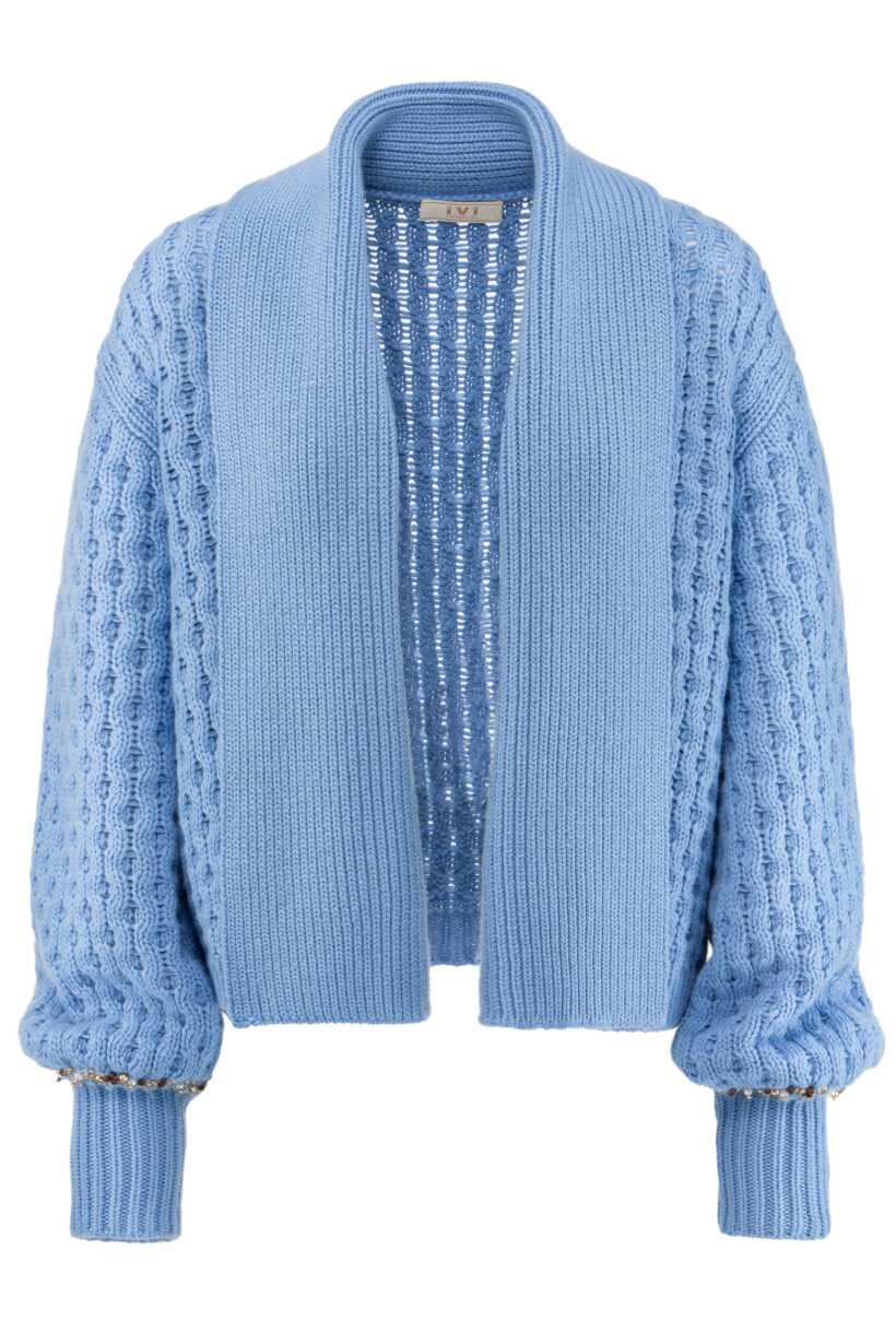 Verkürzter Cardigan im Struktur-Strick mit geripptem Schalkragen. Die mit Lurex durchwobene Perlen Applikation an den Ärmelbündchen verleiht einen Hauch von Luxus.