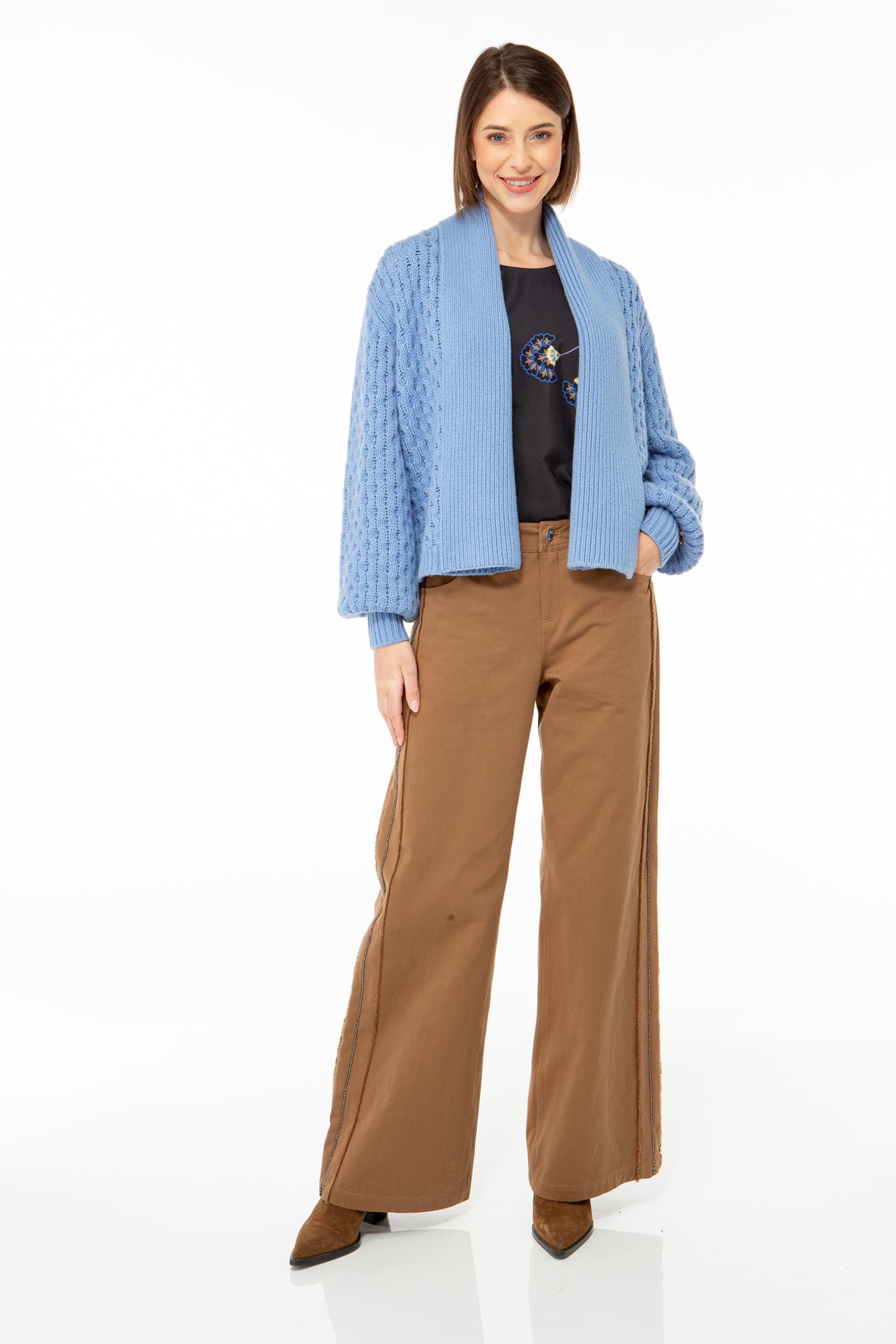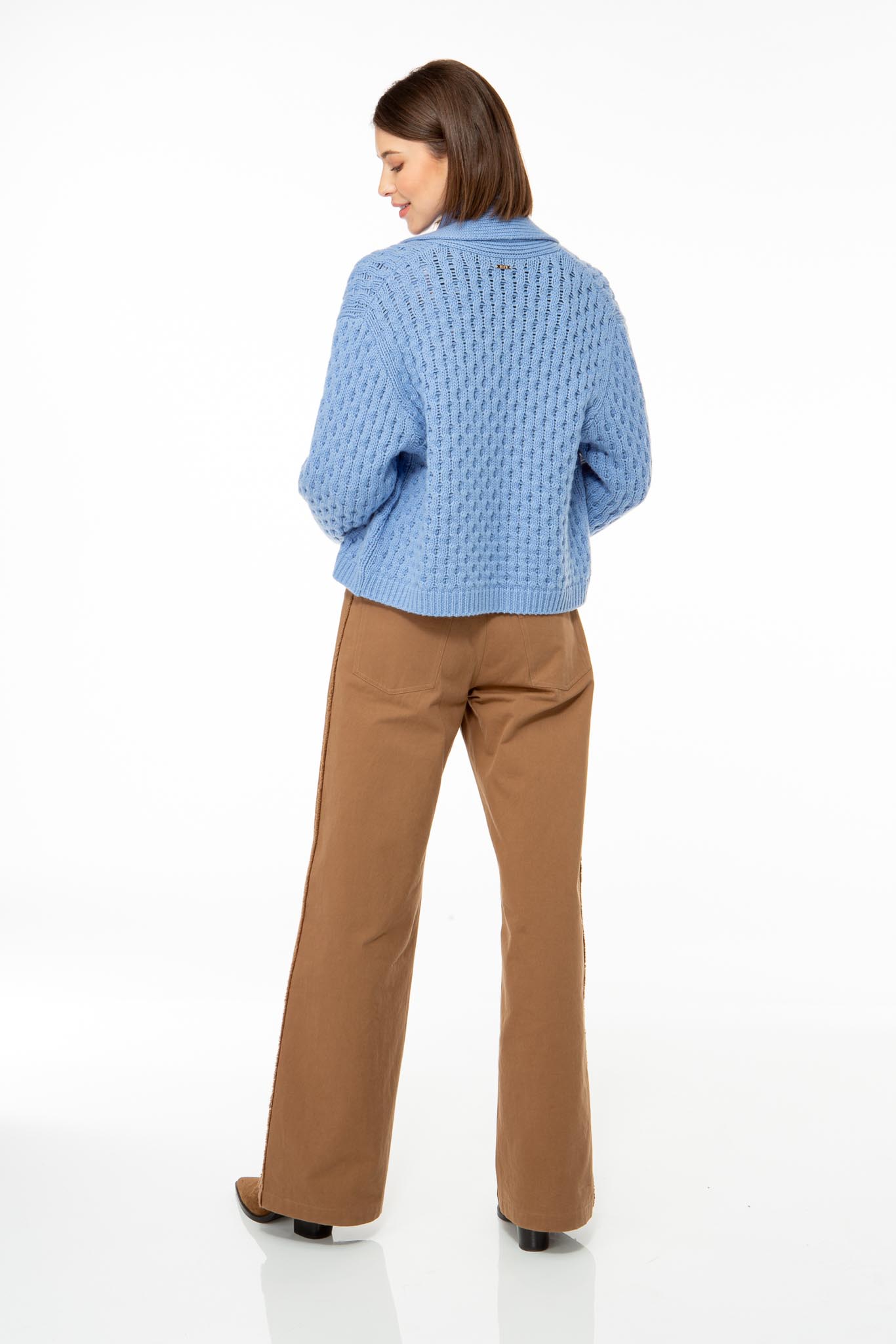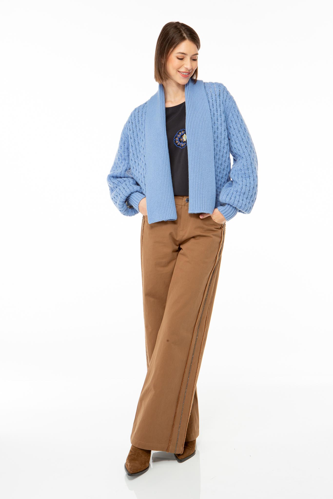 Verkürzter Cardigan im Struktur-Strick mit geripptem Schalkragen. Die mit Lurex durchwobene Perlen Applikation an den Ärmelbündchen verleiht einen Hauch von Luxus.