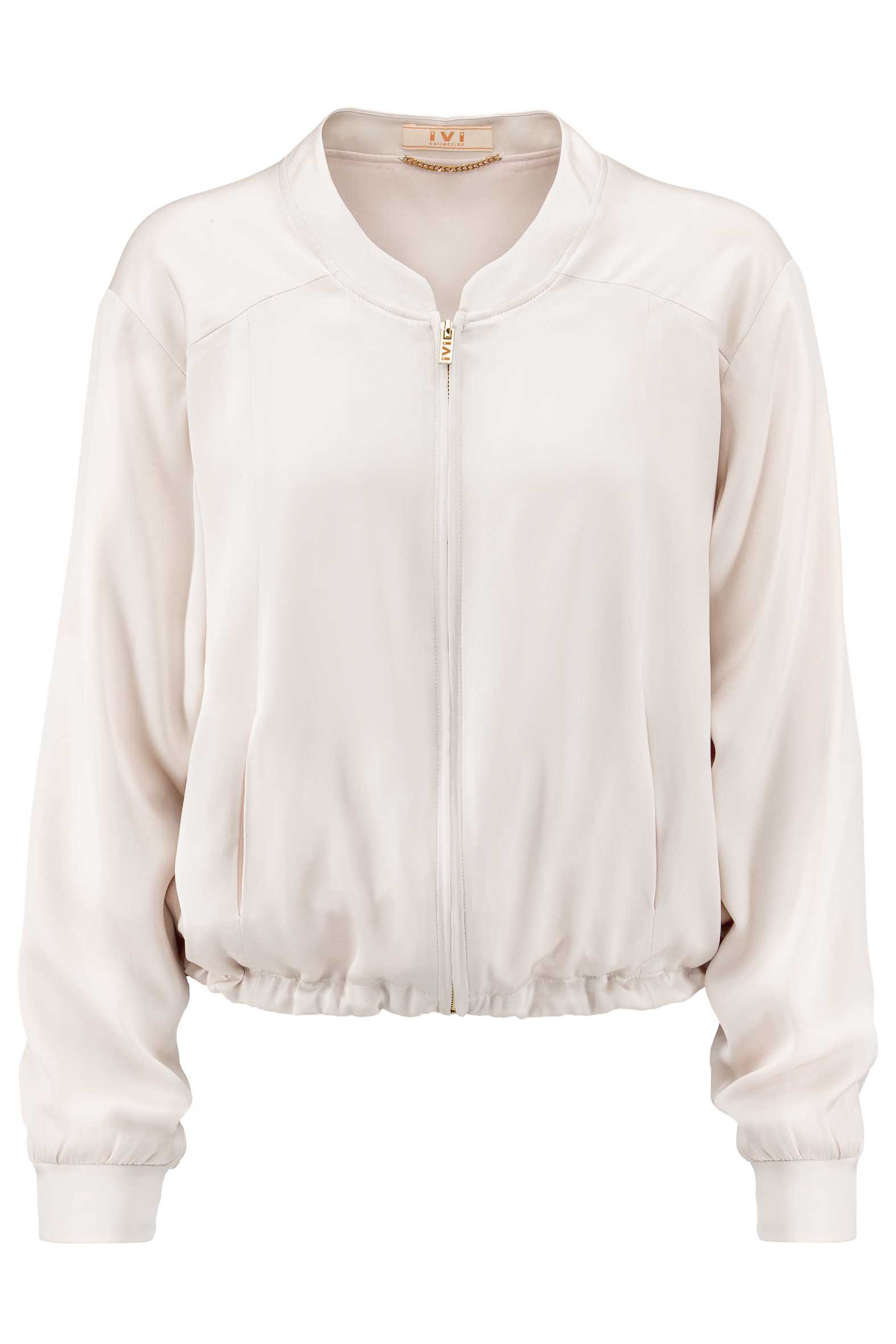Die Jacke besitzt eine Schulterpasse und Teilungsnähte mit kleinen Eingriffstaschen im Vorderteil. Der Rundhals-Ausschnitt mit eingesetztem Kragen und der filigrane goldfarbene Metallreißverschluss unterstreichen den edel sportiven Look.