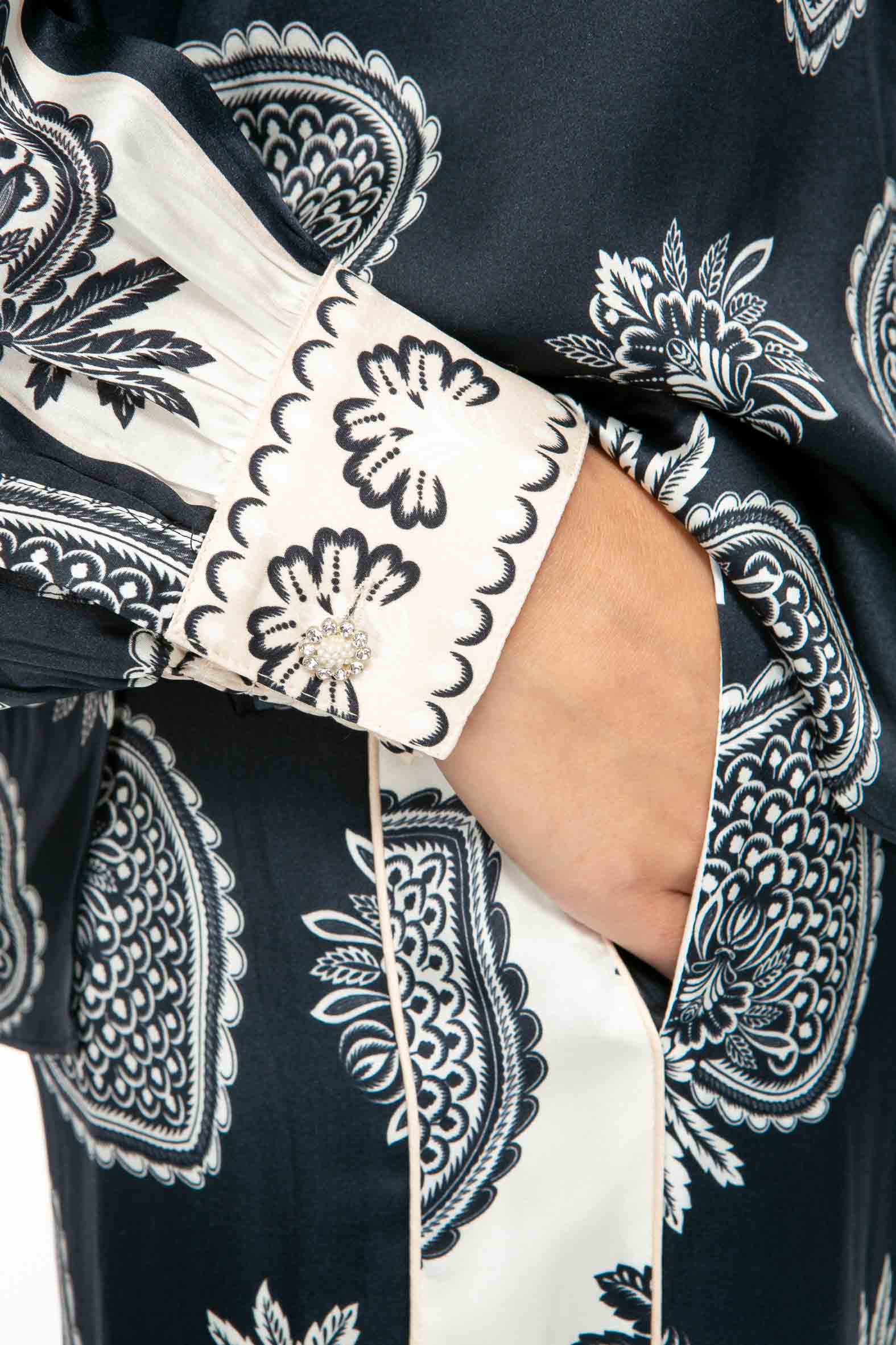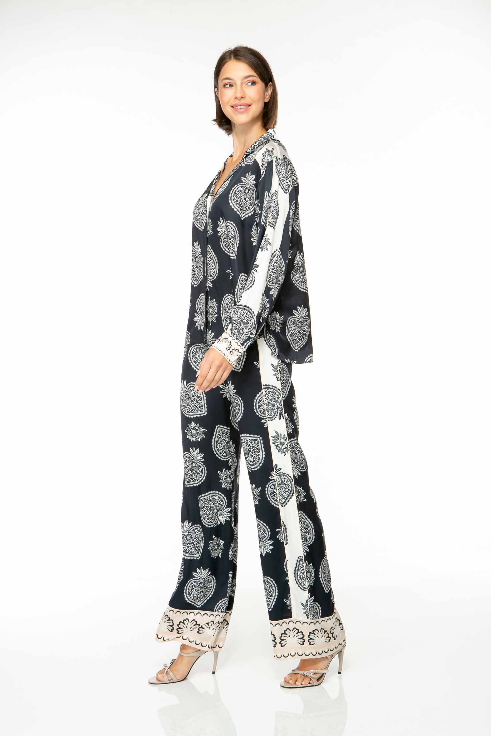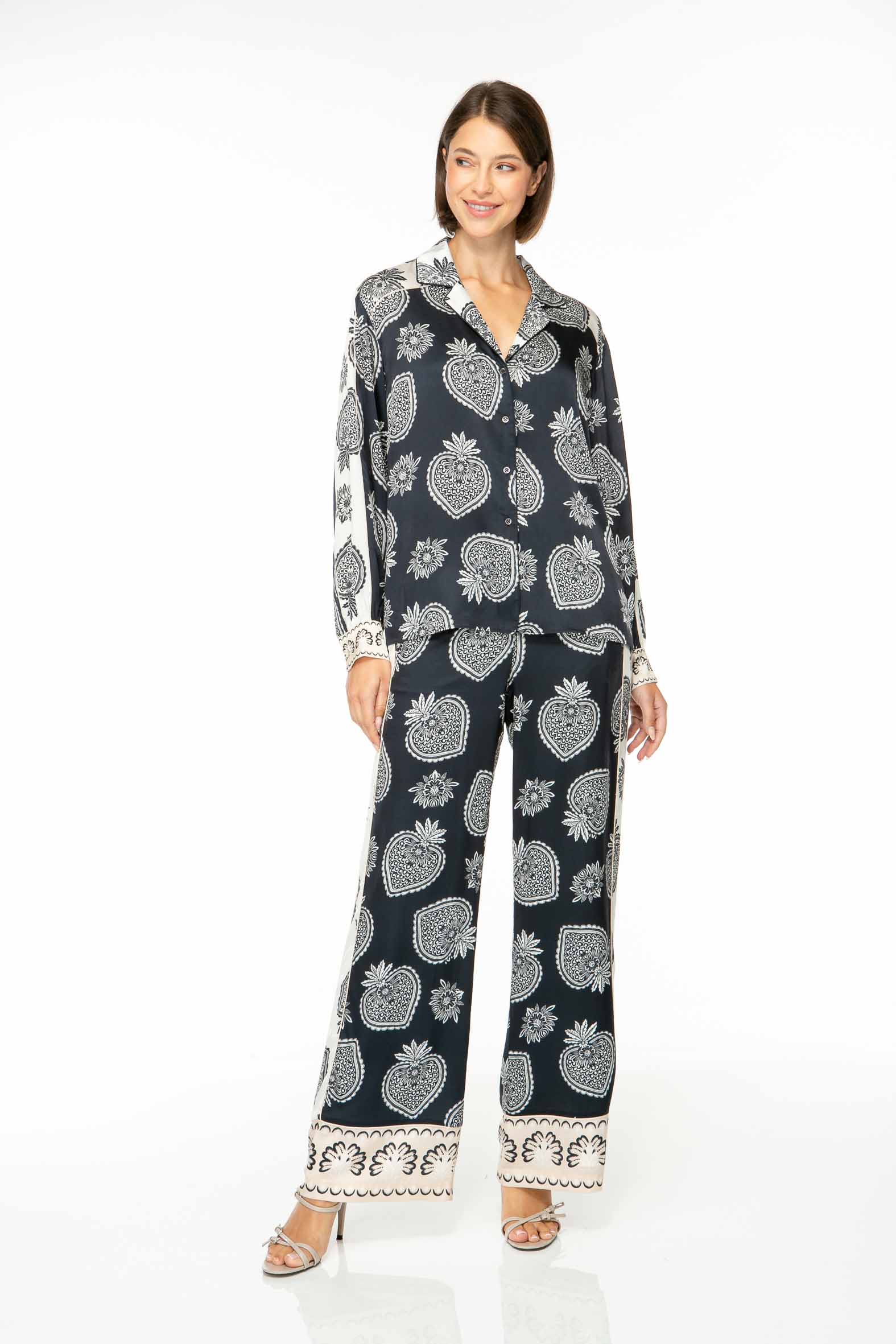 Hemdbluse aus glänzendem Viskose-Seide-Mix mit Print im Colorblock.